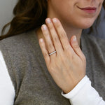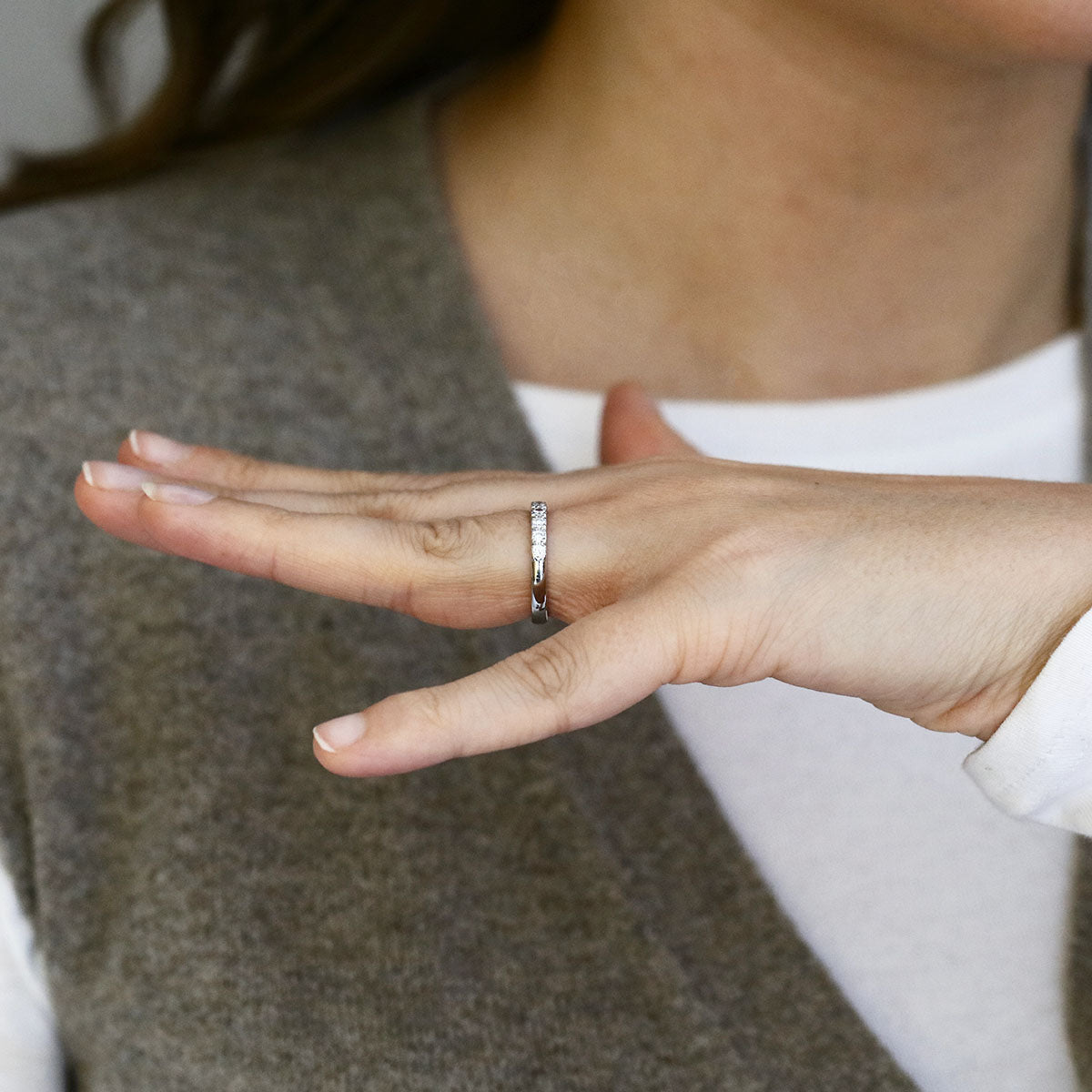 This pre-loved half eternity diamond ring is a timeless piece that beautifully balances elegance and sentiment. A row of round brilliant-cut diamonds, totalling 0.27 carats and graded H/I in colour and SI in clarity, creates a soft, captivating sparkle across the finger. The refined 2.2mm shank tapers gracefully out to a 2.8mm setting, giving the ring a delicate, comfortable profile that’s perfect worn alone or stacked.