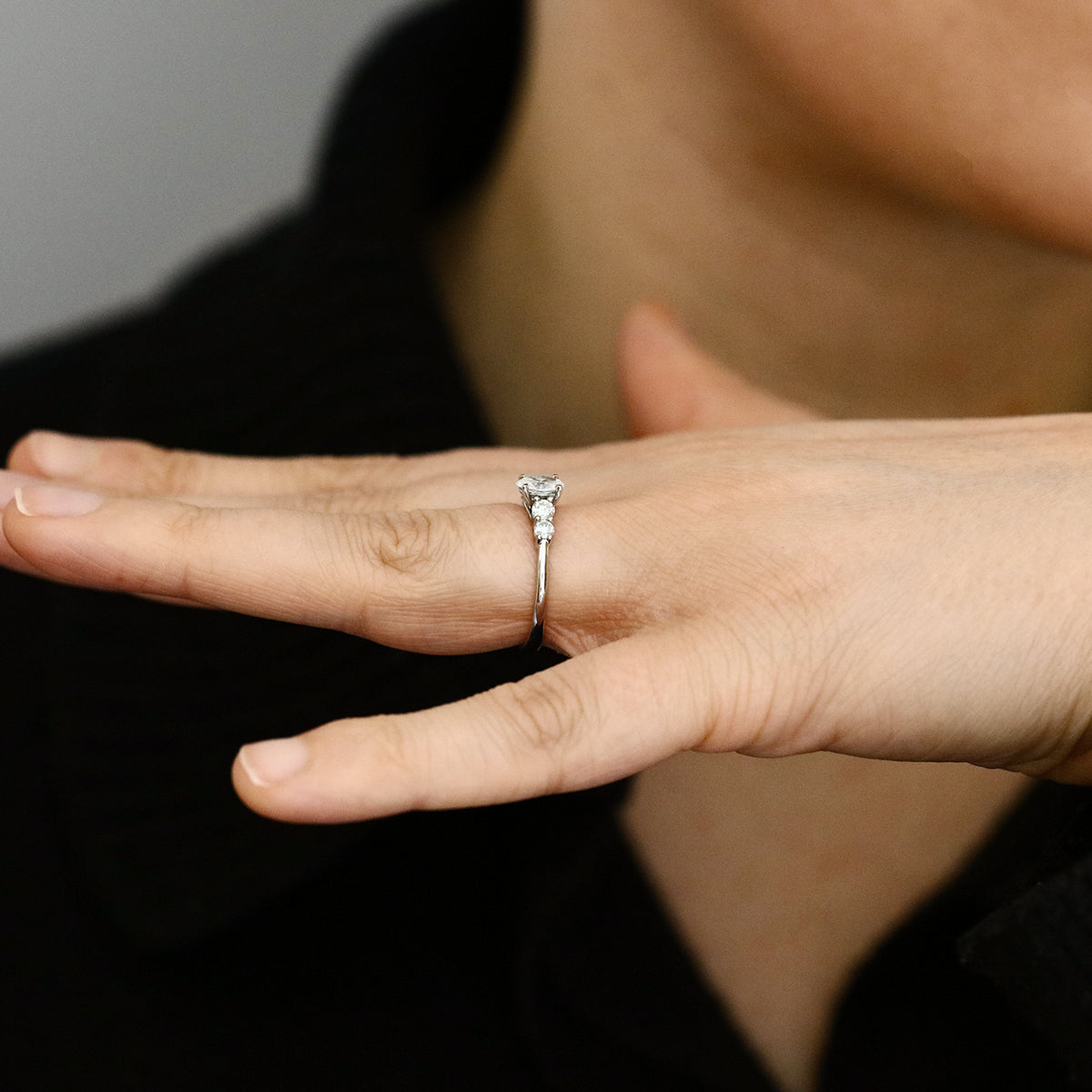 Crafted from 18K white gold with comfort and style in mind, the shank tapers elegantly from 2.2mm to 1.2mm, allowing for a graceful fit, while the head of the ring, with its central stone standing at 5.3mm, offers the perfect balance of presence and wearability.