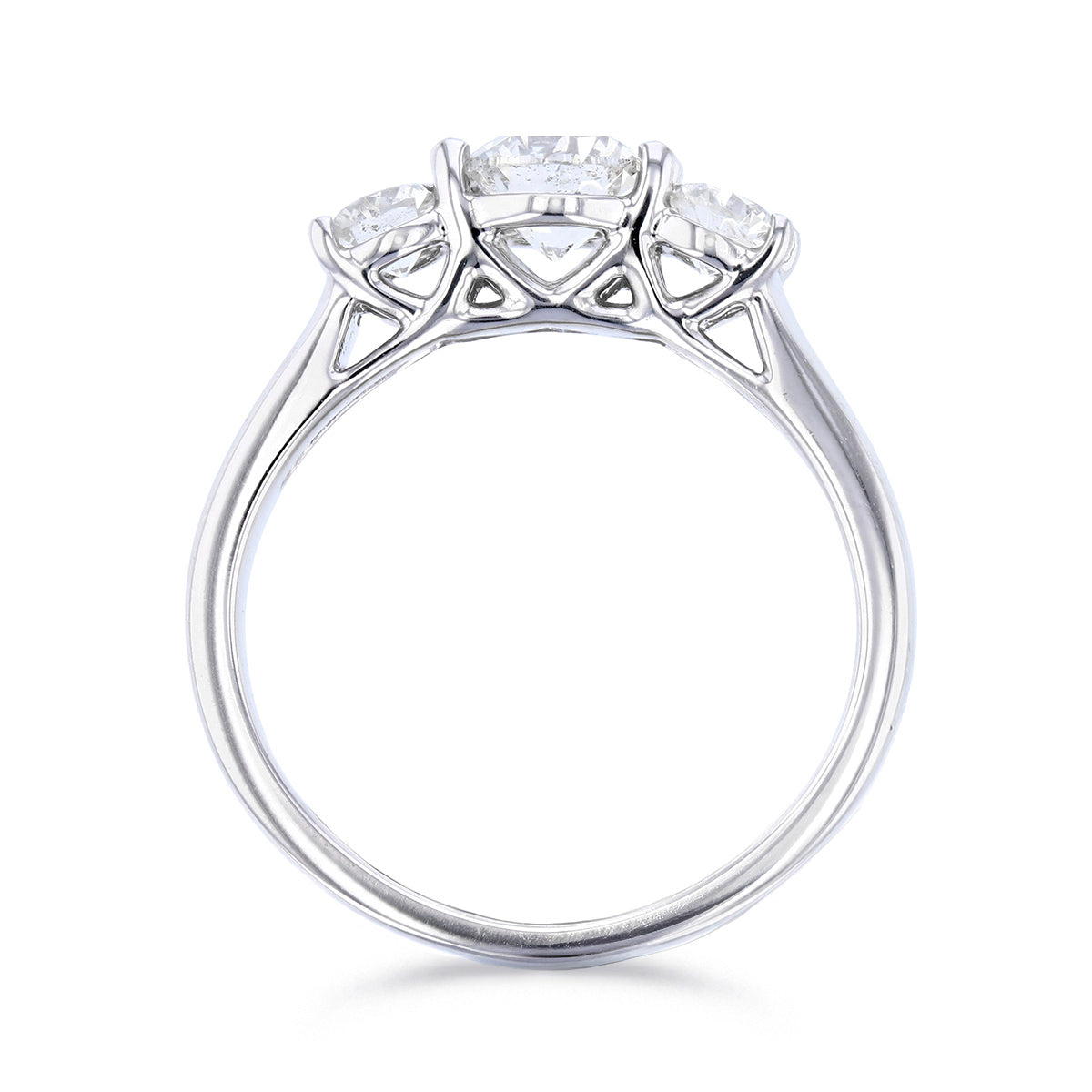 At its centre sits a 0.56ct brilliant-cut diamond, graded H/I colour with I1–I2 clarity, offering lively sparkle and presence. It is flanked by two brilliant-cut side diamonds of 0.17ct each (total side diamond weight 0.34ct), graded H/I colour and SI2–I1 clarity, creating a balanced and classic three-stone silhouette.