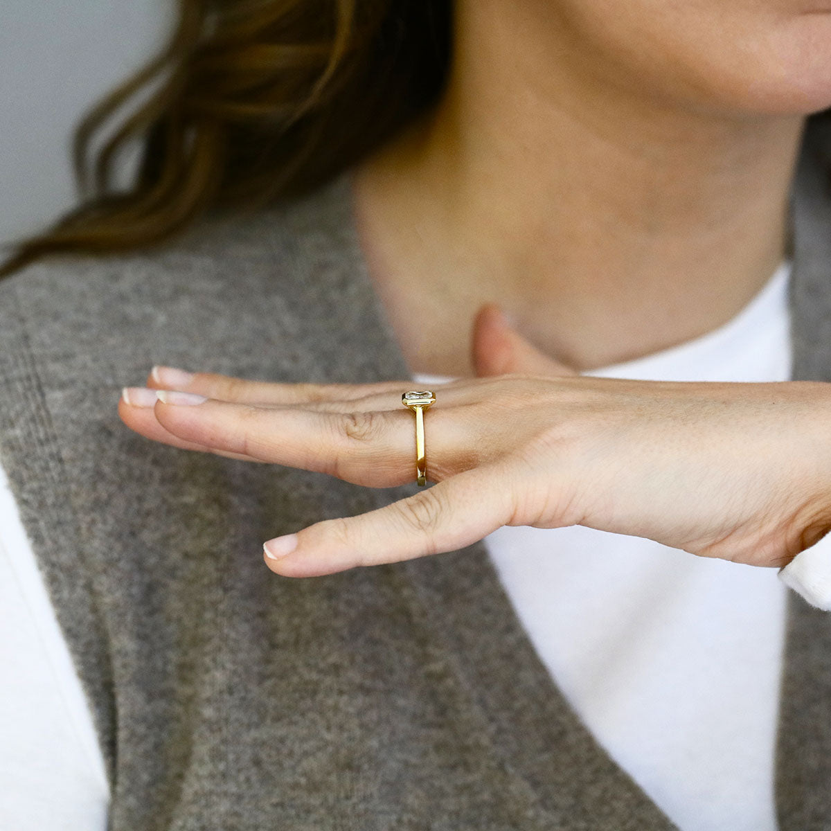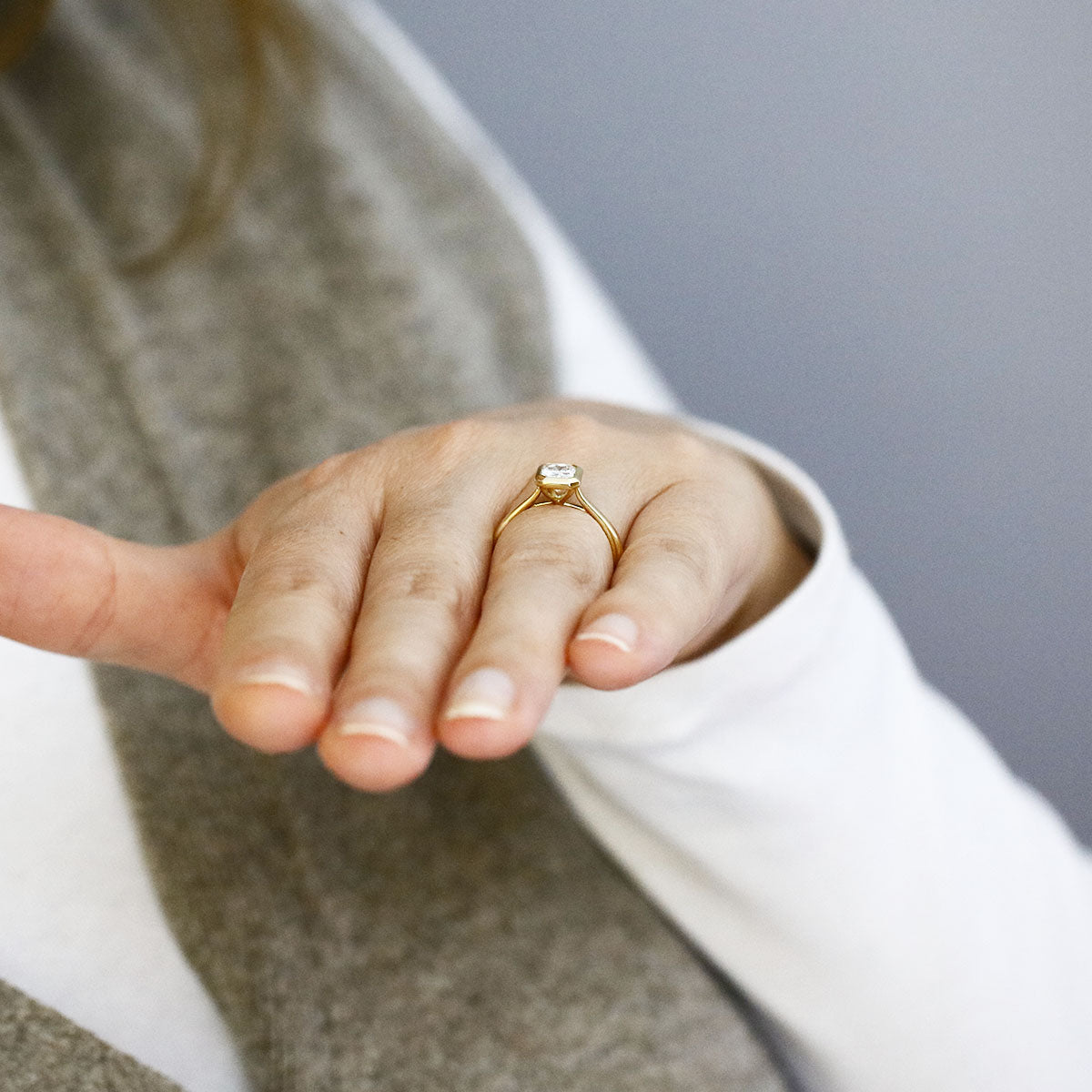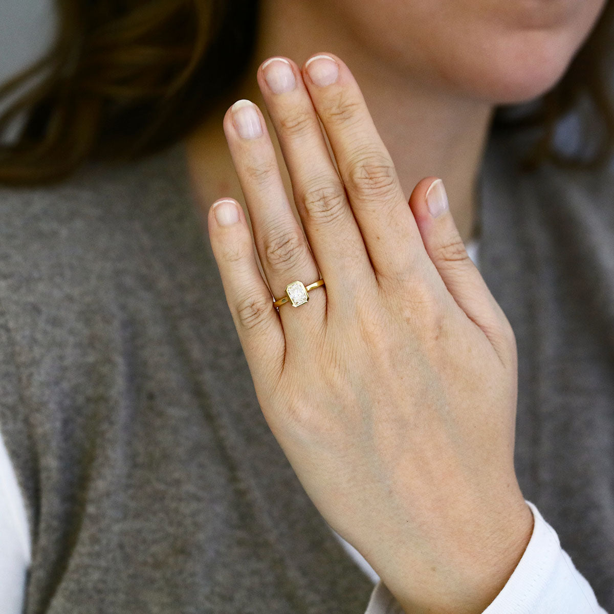 This pre-loved 1.00ct radiant cut diamond ring is a striking example of contemporary elegance. The diamond, graded G/H colour and VVS2/VS1 clarity, is expertly set in a newly crafted 18K yellow gold bezel mount, creating a modern, clean silhouette that perfectly showcases the stone’s brilliance.