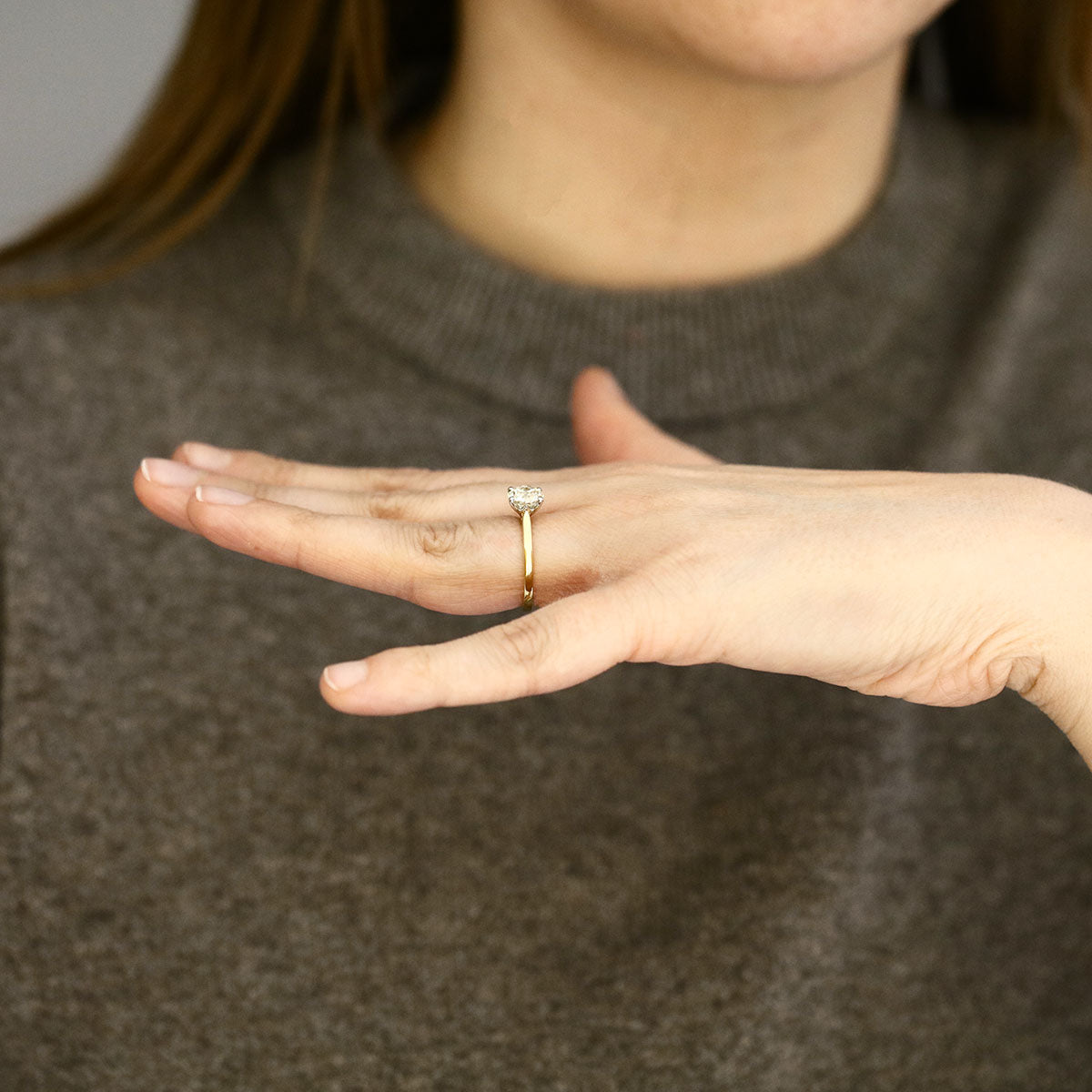 The diamond’s VS1 clarity ensures remarkable purity to the naked eye, while the soft warmth of its J colour adds a romantic glow that pairs beautifully with 18K yellow gold.