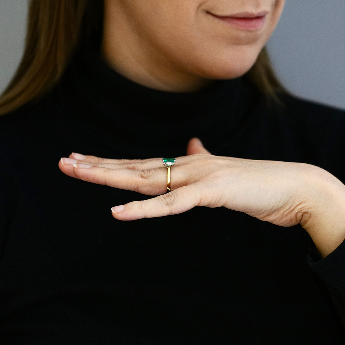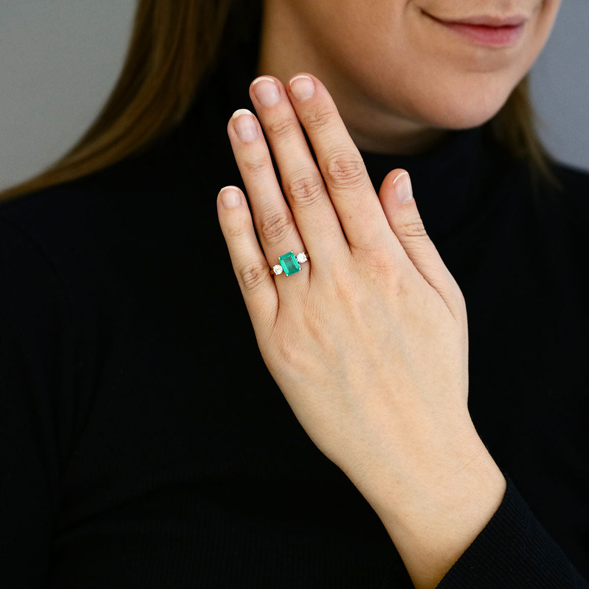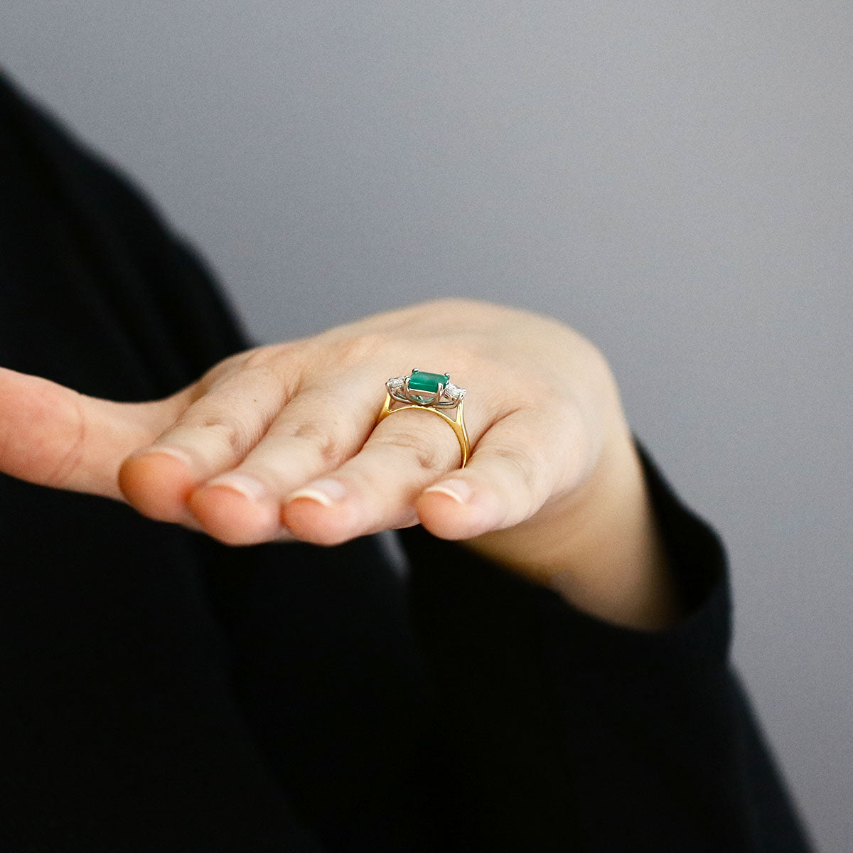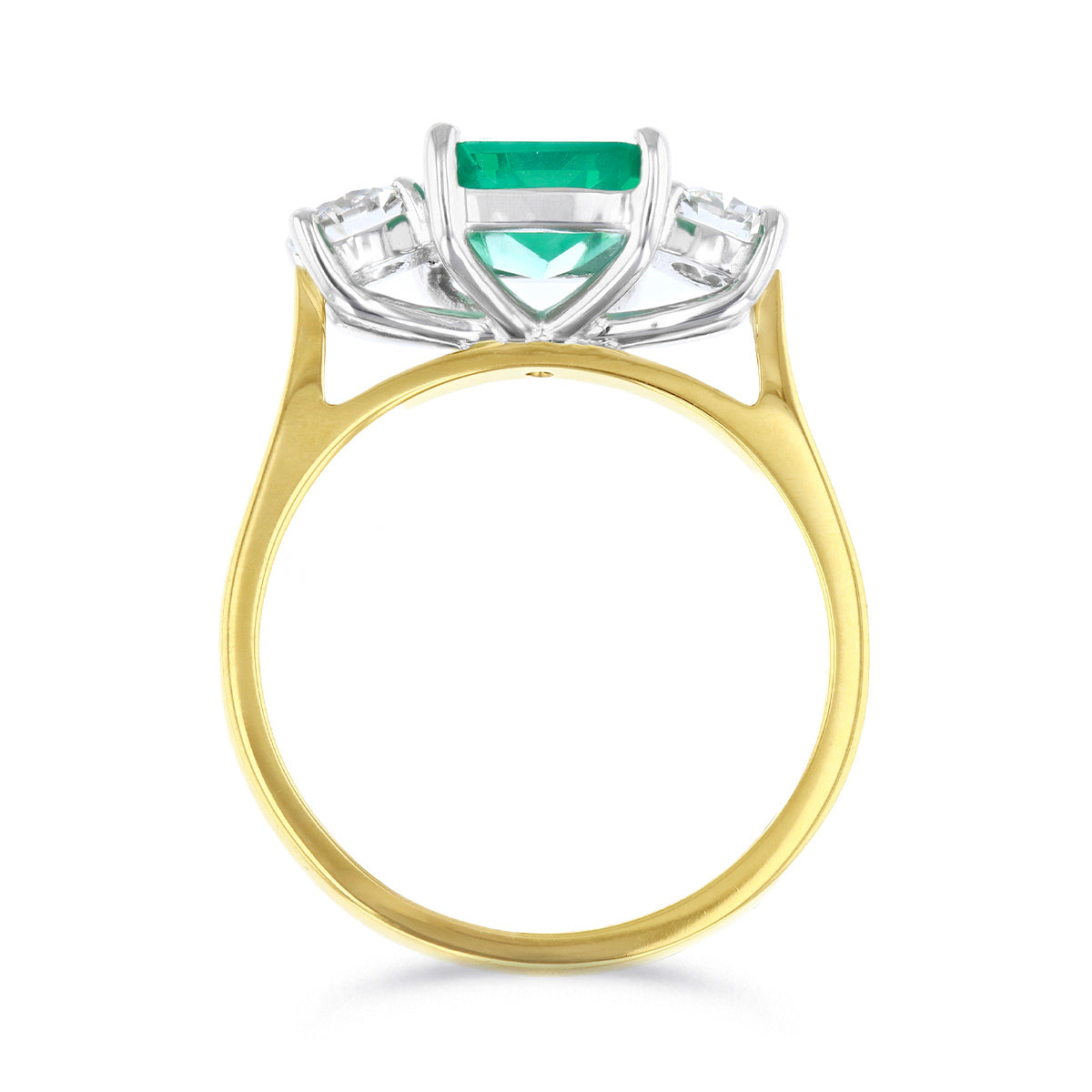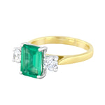 A striking celebration of colour and craftsmanship, this three-stone ring showcases a 1.57ct emerald-cut emerald, prized for its vivid green hue and distinctive step-cut brilliance. The centre stone is complemented by 0.50ct of brilliant round-cut diamonds (total), graded G/H colour and SI1/SI2 clarity, adding radiant sparkle that enhances the emerald’s natural vibrancy.