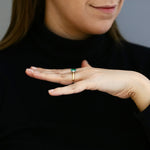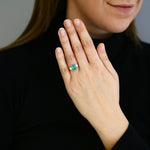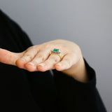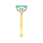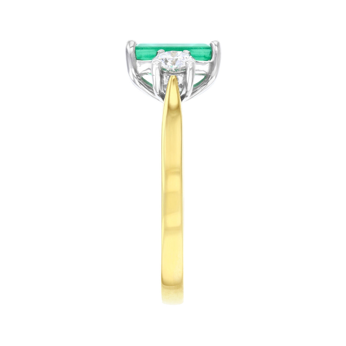 The gemstones are securely set within a platinum setting, chosen for its strength and refined luminosity, while the 18K yellow gold shank introduces a warm contrast that accentuates the emerald’s richness. This thoughtful combination of metals brings depth, character, and timeless appeal to the design.