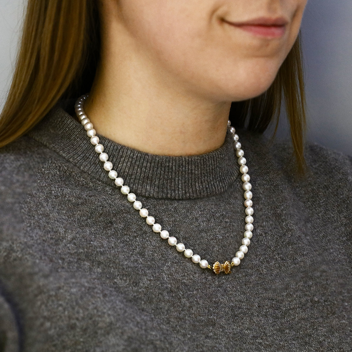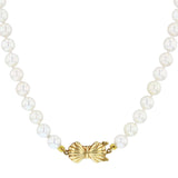 This beautiful 16" pearl strand showcases lustrous 6.6mm pearls with a delicate pink and white sheen, offering a soft, elegant glow. Securing the strand is a beautifully crafted bow clasp in 14K yellow gold, stamped 585, measuring 9.5mm by 20.7mm, adding a touch of sophistication and charm. Perfect for layering or wearing alone, this timeless piece combines classic elegance with a feminine, contemporary detail.