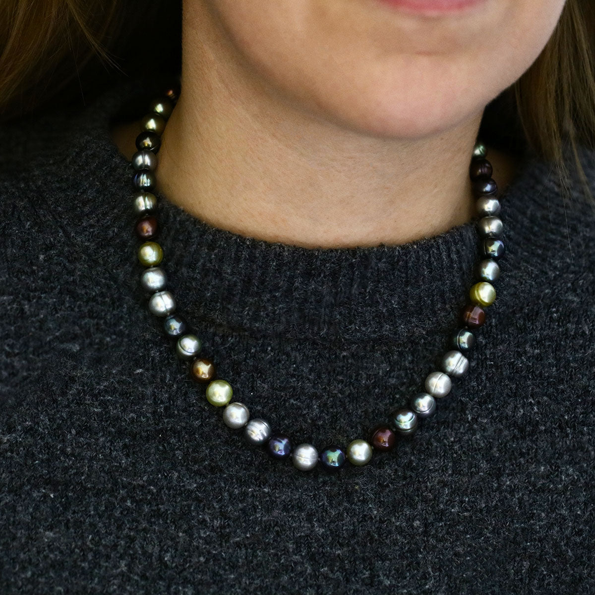 Elevate your jewellery collection with this beautiful pre-loved pearl necklace, featuring a secure 14K safety hoop clasp. Measuring 18", it showcases a strand of lustrous 9mm pearls in a captivating blend of grey and greeny tones - a modern twist on a classic accessory. Each pearl displays subtle variations in hue and lustre, creating a uniquely sophisticated piece that complements both casual and formal ensembles.