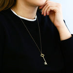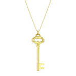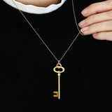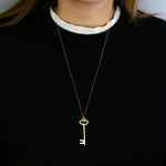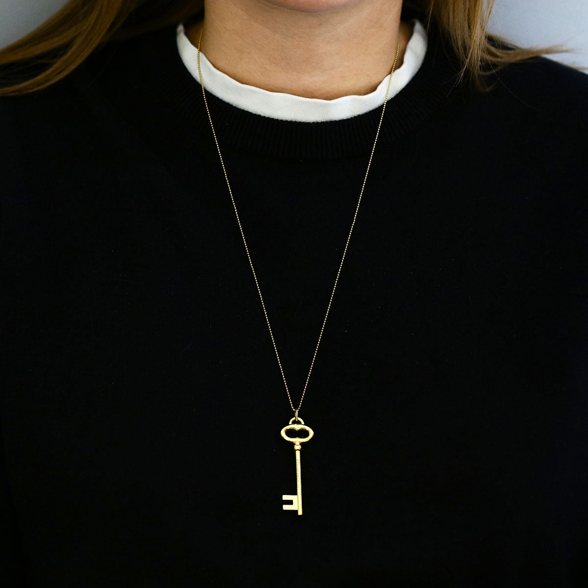 Suspended from a 24-inch chain, the key has a graceful, elongated silhouette that sits effortlessly on the neckline, making it perfect for layering or wearing as a standalone statement.