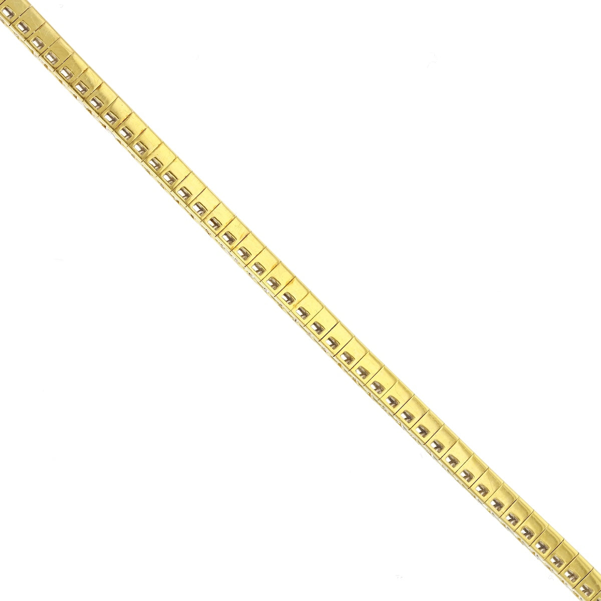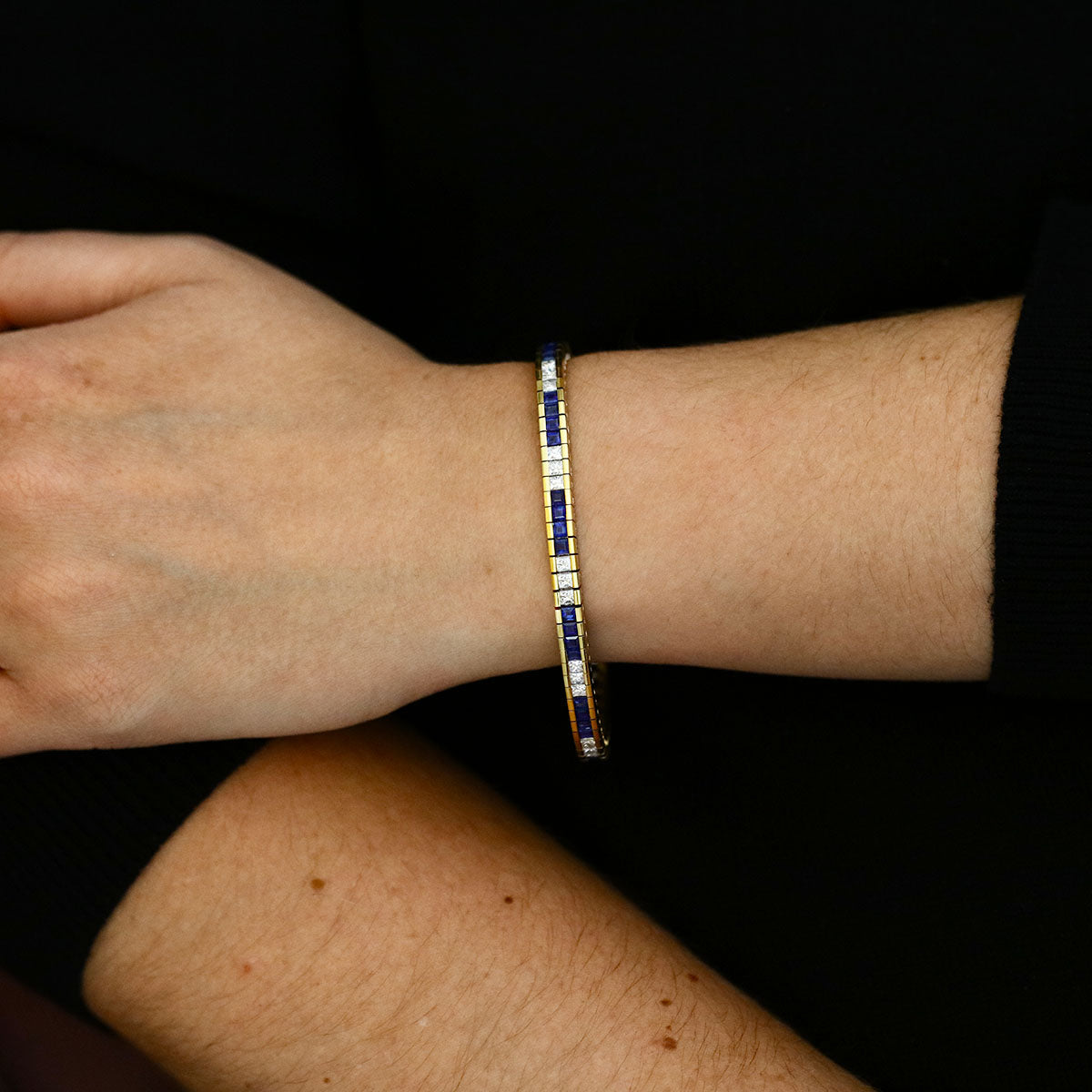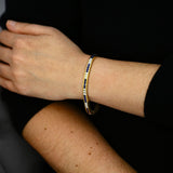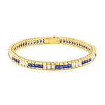 A striking expression of sophistication and craftsmanship, this beautiful 7" bracelet showcases a seamless line of rich blue sapphires (4.40ct) and brilliant cut diamonds (3.30ct), meticulously channel-set in 18K yellow gold. The contrast between the deep royal blue of the sapphires and the bright sparkle of the G/H colour, VS1–VS2 clarity diamonds creates a captivating rhythm of light and colour.