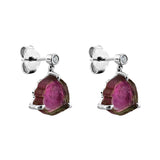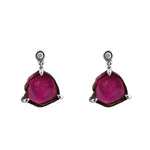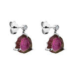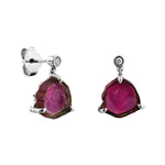 These beautiful sliced 5.95ct tourmaline earrings in 18K white gold offer a unique blend of natural beauty and contemporary elegance. Each earring features an organic slice of watermelon tourmaline, showcasing mesmerising hues of deep pink and earthy green, framed in delicate claw settings that highlight the gemstone's raw, unrefined charm.