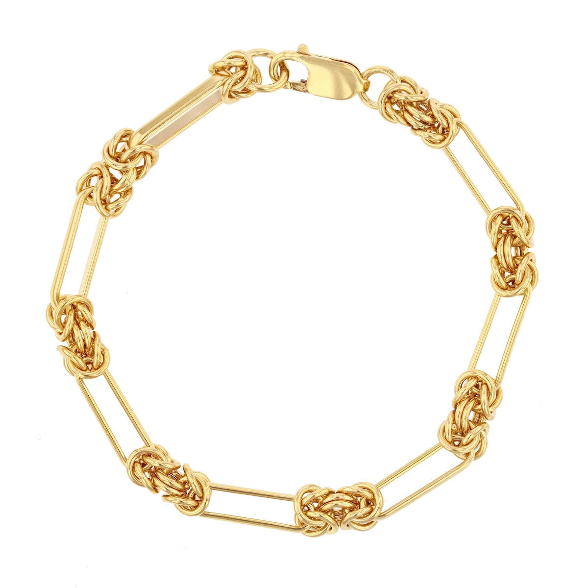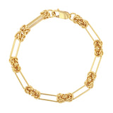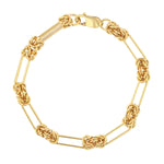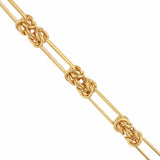 Elegant and beautifully crafted, this pre-loved 9K yellow gold fancy link bracelet features an intricate combination of polished bar and knotted links, creating a timeless and sophisticated design. Measuring approximately 7.5" in length, the bracelet offers a comfortable fit with a lovely drape on the wrist.