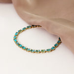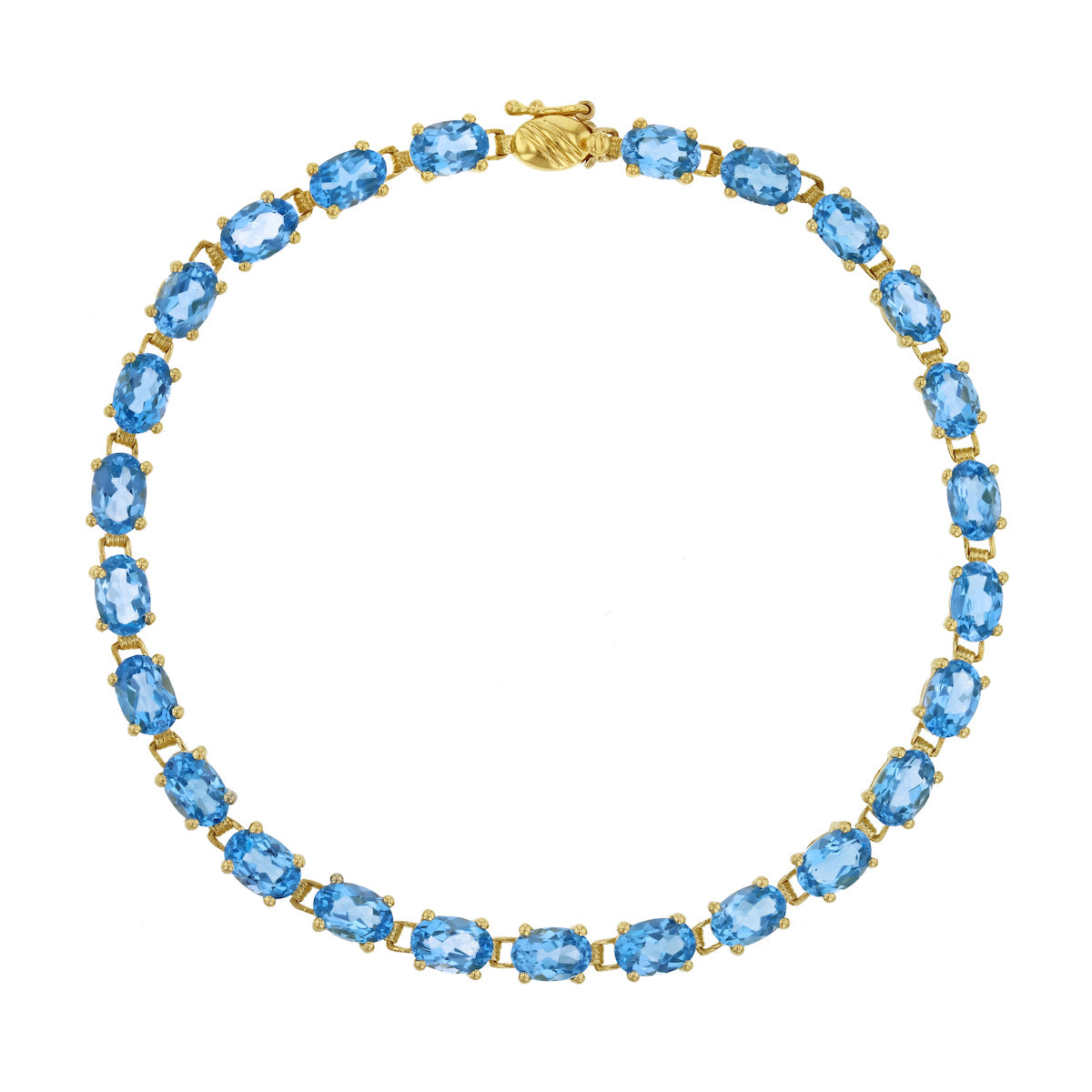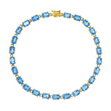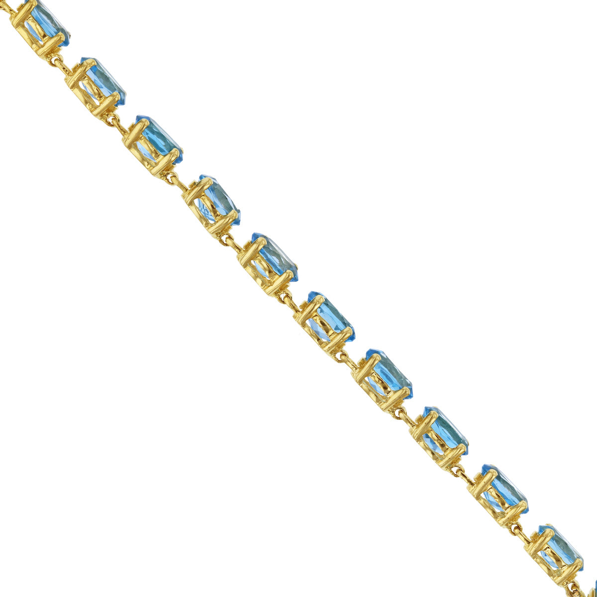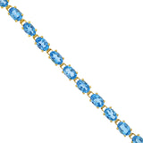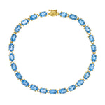 This stunning pre-loved 8" blue topaz bracelet, crafted in 14K gold (stamped 585), exudes timeless elegance. Featuring 25 vibrant blue topaz gemstones (each approx. 6x4mm), this bracelet sparkles with captivating brilliance. The stones are securely set in a classic design, making it a perfect statement piece for any occasion.