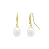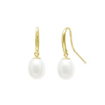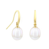 Pearlessence Collection White Teardrop Cultured River Pearl Drop Earrings With Shepherds Crook | 9K Yellow Gold