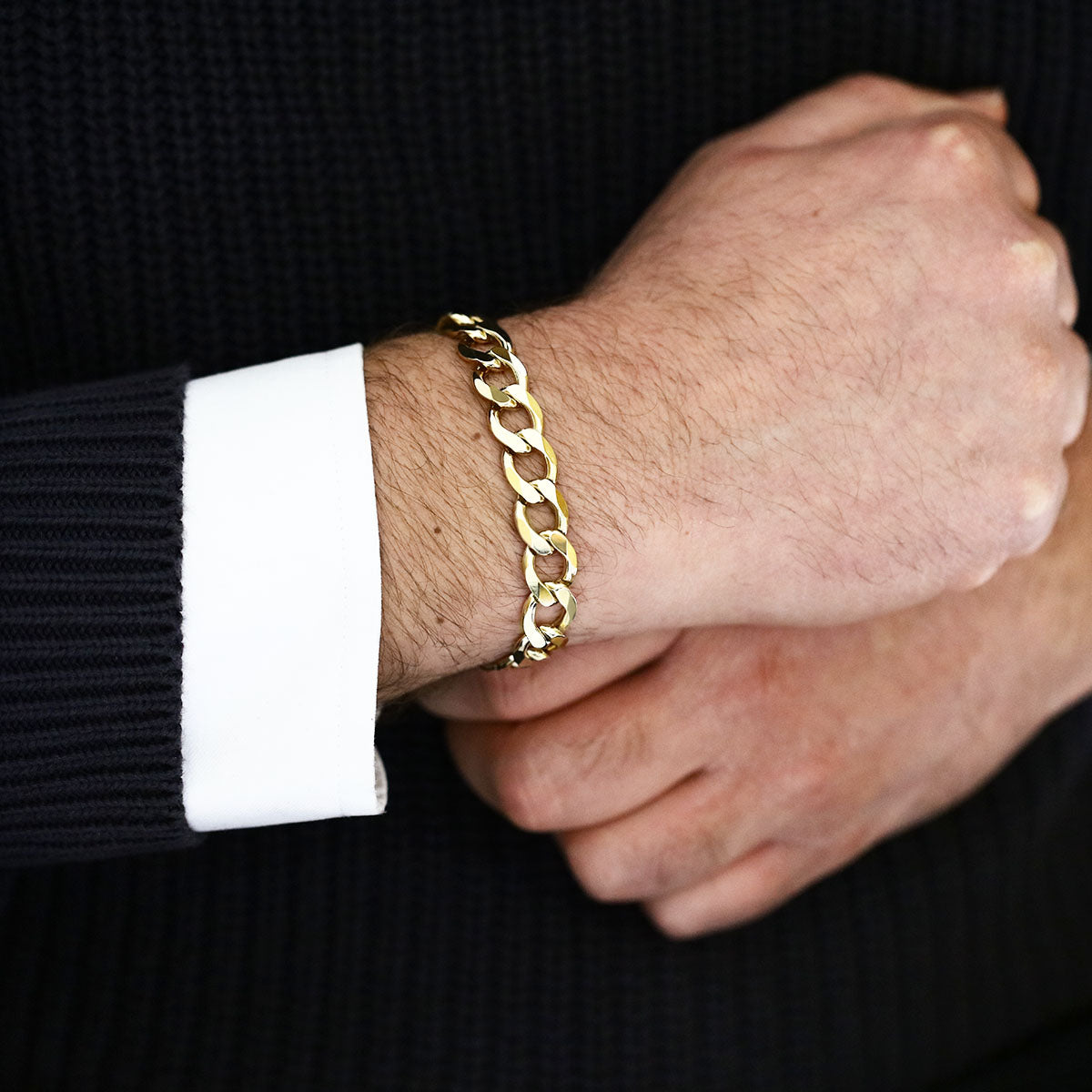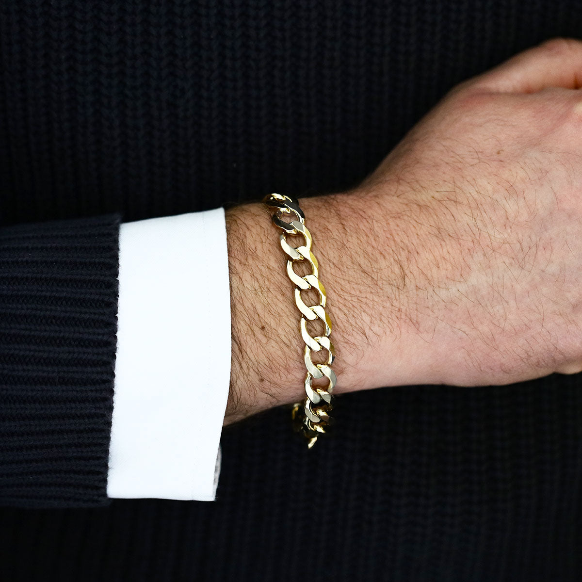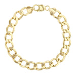 This classic 9" plain curb bracelet is crafted with a timeless design, featuring solid links that measure approximately 10mm by 15mm. With a substantial weight of 29 grams, the bracelet has a confident, luxurious feel on the wrist while retaining effortless versatility.
