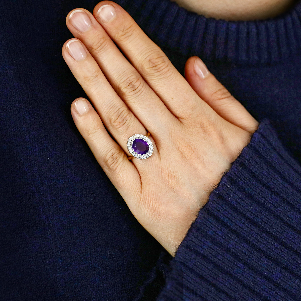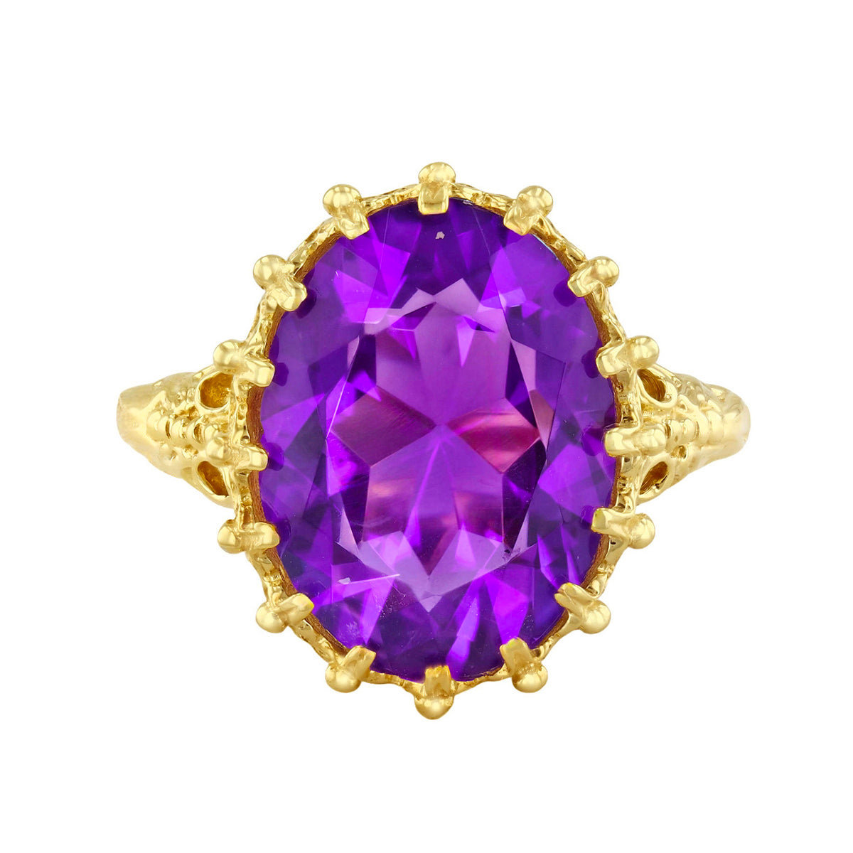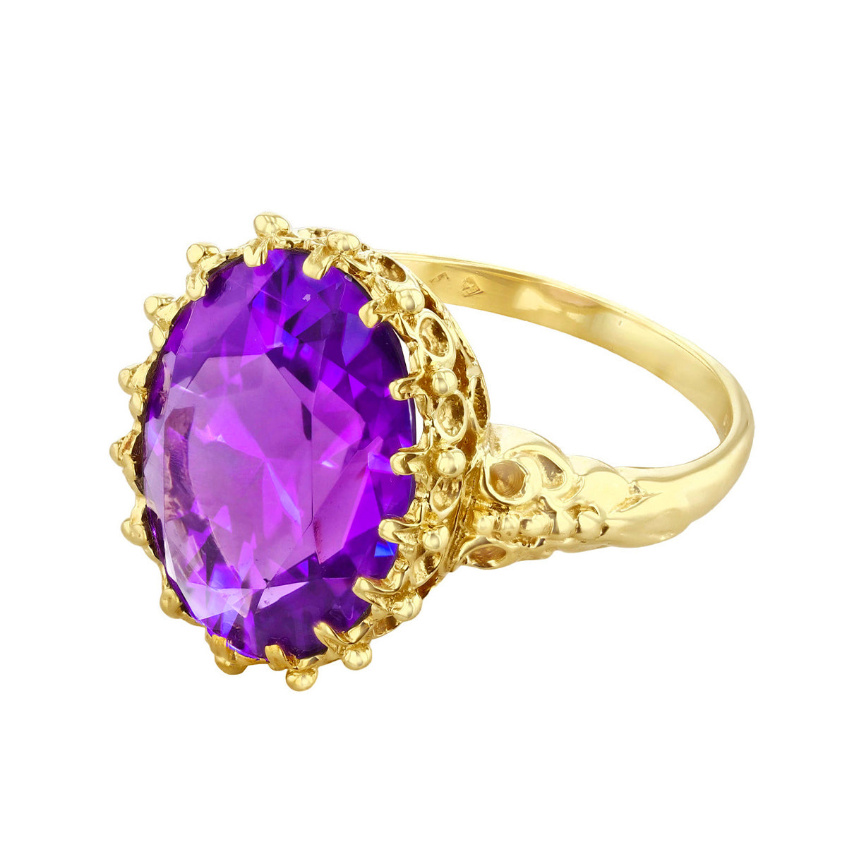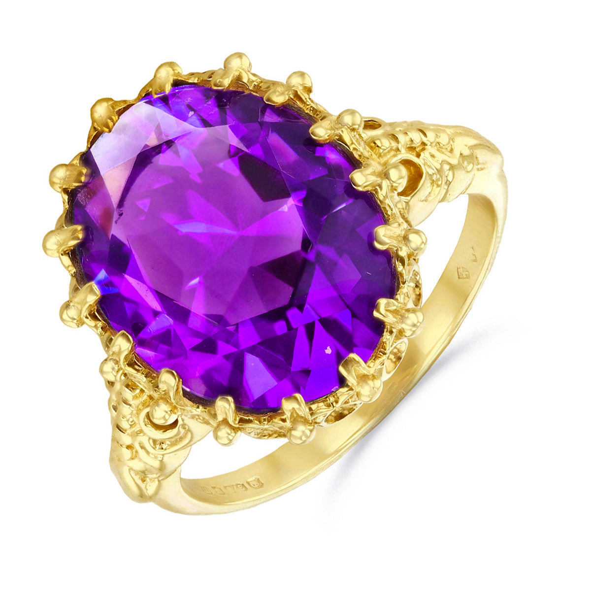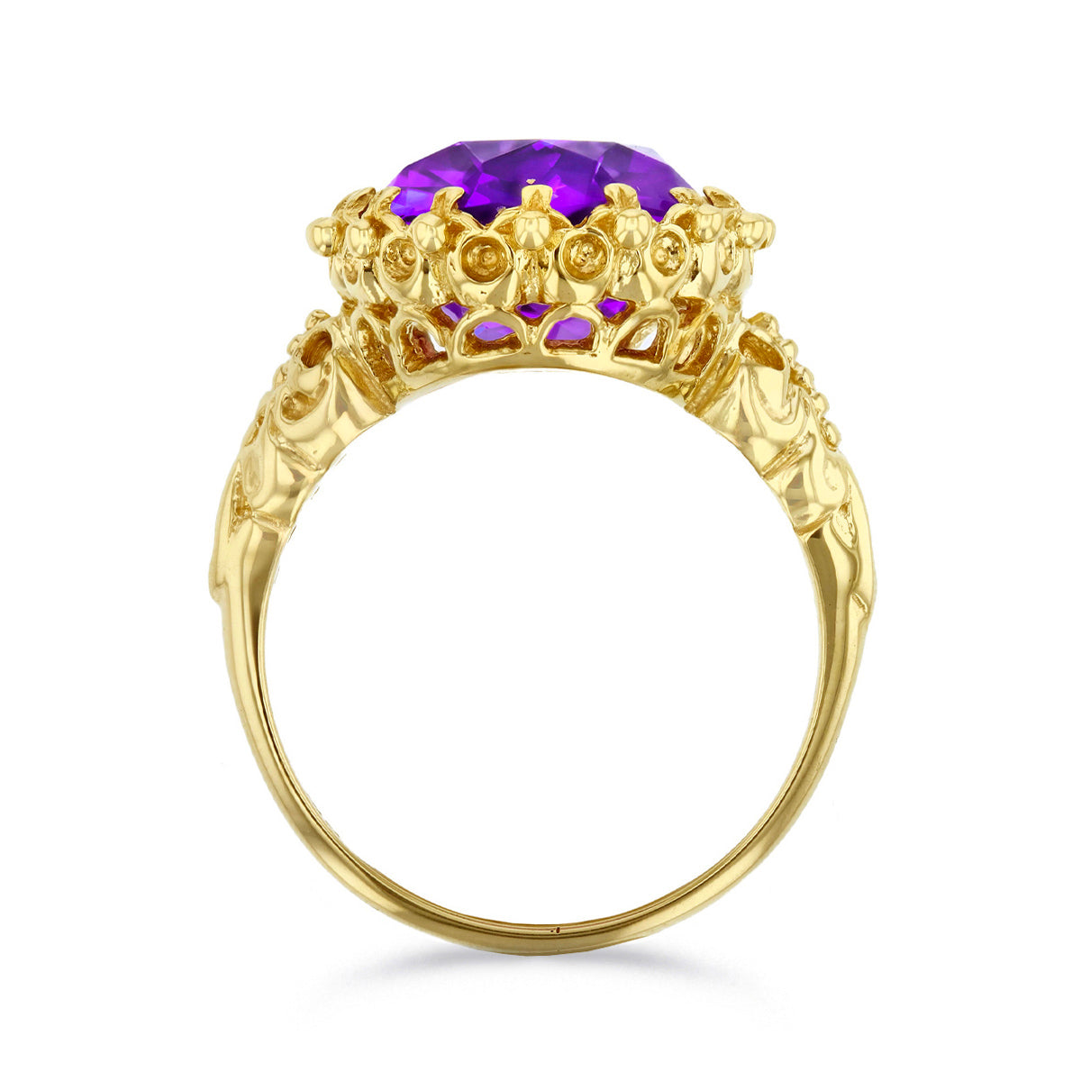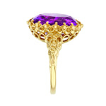 A true statement of vintage-inspired elegance, this amethyst dress ring is crafted in 9K yellow gold and showcases a mesmerizing 18.6mm x 15.3mm amethyst gemstone. The stone’s deep purple hue is beautifully complemented by an ornate bead and scroll decoration, adding an antique charm to the design.