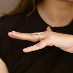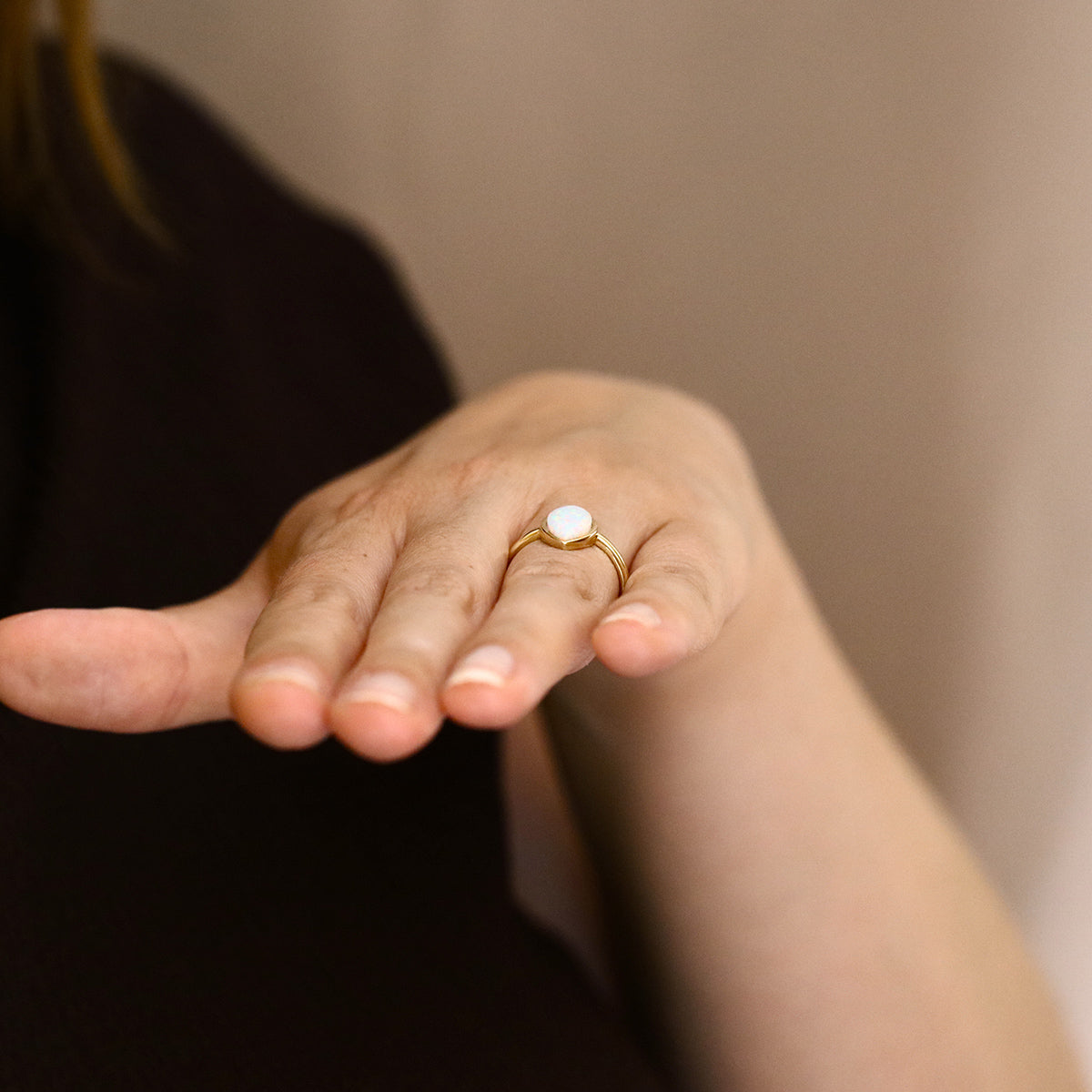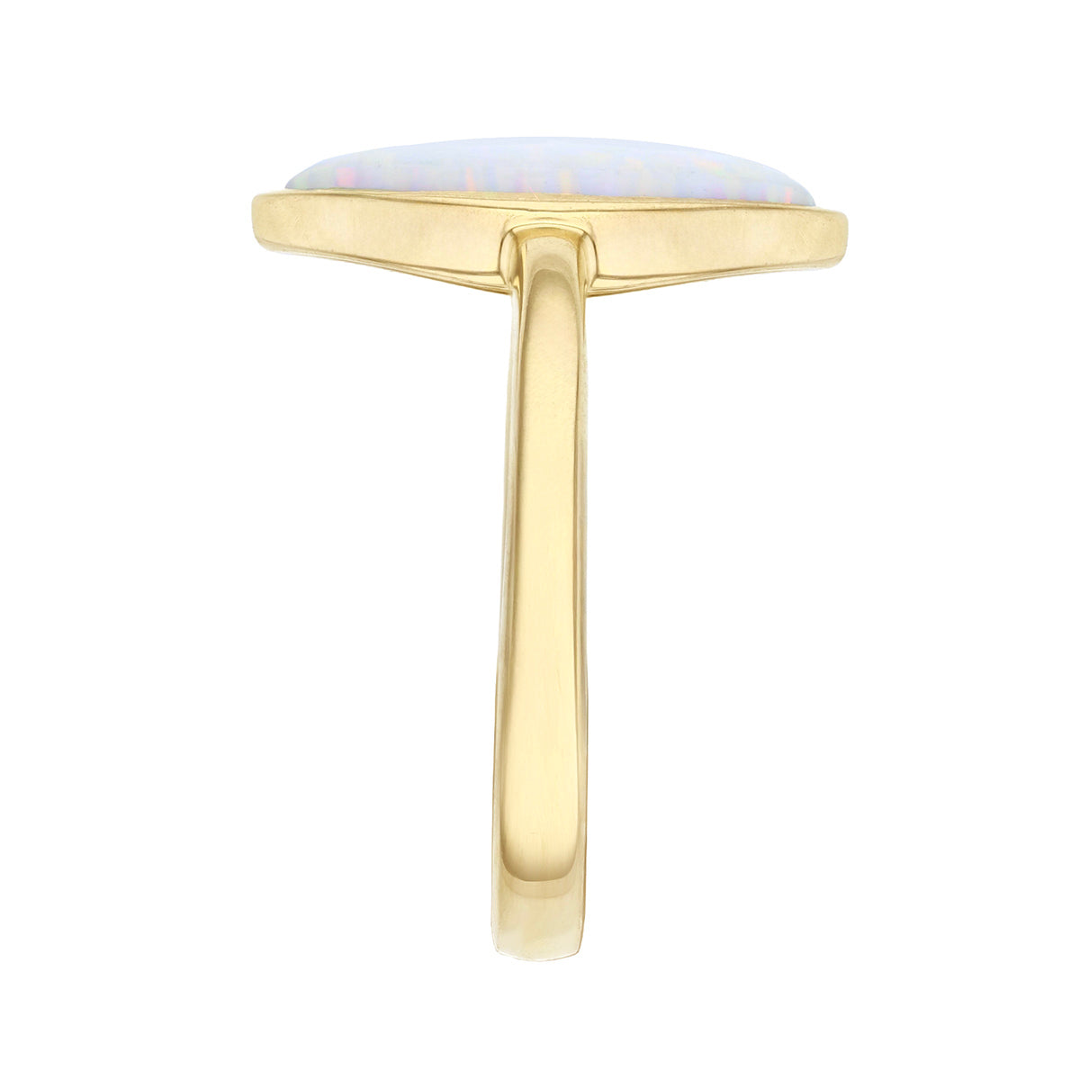 This elegant dress ring showcases a captivating 14 x 7mm marquise-cut cultured opal, its luminous play of colour shimmering with flashes of soft blues, greens, and warm pinks. The sleek bezel setting not only frames the opal beautifully but also offers a smooth, contemporary finish that enhances comfort and durability. Crafted in rich 9K yellow gold, the warm tones of the metal perfectly complement the opal’s iridescent hues, making this piece an eye-catching addition to any jewellery collection. Ideal for both special occasions and everyday elegance, this ring is a timeless celebration of refined style.
