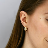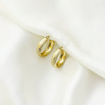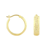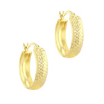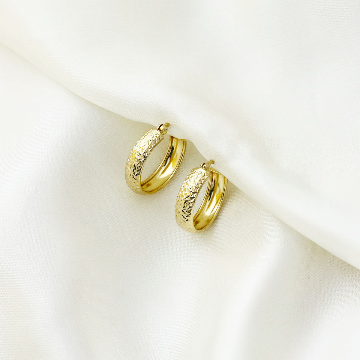 The 5mm wide hoops feature an intricate diamond-cut pattern that catches the light beautifully, creating a soft shimmer with every movement. The textured finish adds dimension while maintaining a classic silhouette, making them effortlessly versatile - polished enough for evening, refined enough for daily wear.
