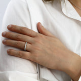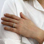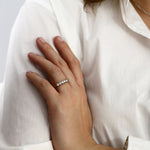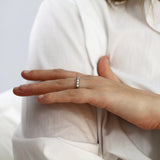 The focal point of this ring is the arrangement of seven dazzling diamonds, delicately set with 18K white gold claw settings. The open design allows each stone to shine independently, showcasing their individual brilliance and character. The claw setting ensures maximum exposure to light, resulting in a mesmerising play of sparkle.