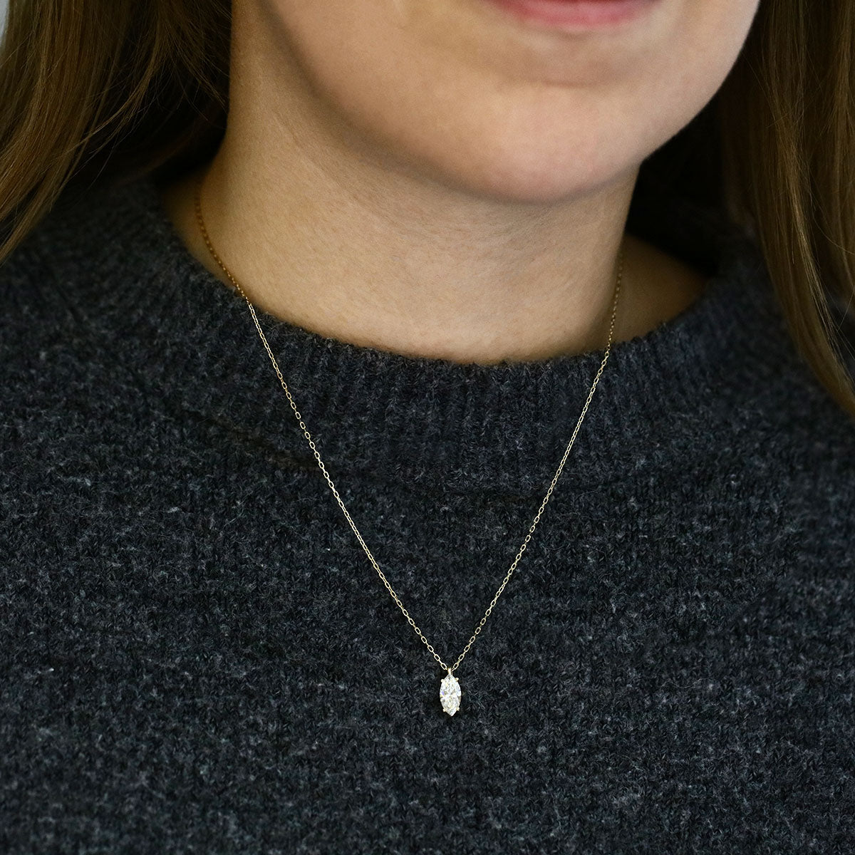 Elegant, refined, and effortlessly wearable - this necklace celebrates timeless sophistication in its purest form. A 1.00ct lab-grown marquise diamond, graded E colour and VS1 clarity, is expertly set to capture and reflect the light with brilliance. Suspended delicately from an 18" chain, the diamond sits beautifully against the neckline, adding a touch of everyday luxury to any look.
