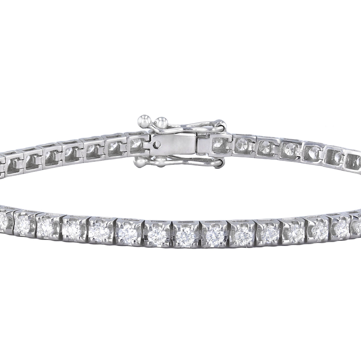 Each meticulously selected diamond boasts exceptional brilliance, totaling 2.00 carats, D/E colour, VS1 clarity, adorning your wrist with a captivating sparkle that effortlessly transitions from day to night. Set in a classic tennis bracelet design, the stones are expertly handset in a secure and seamless manner, ensuring both durability and beauty.