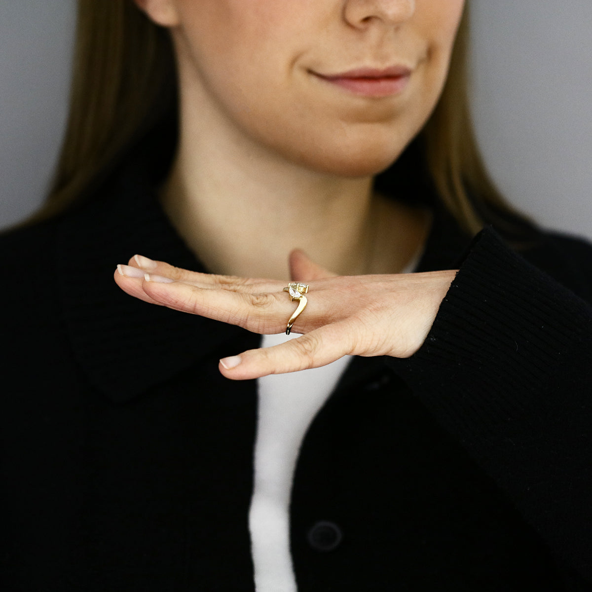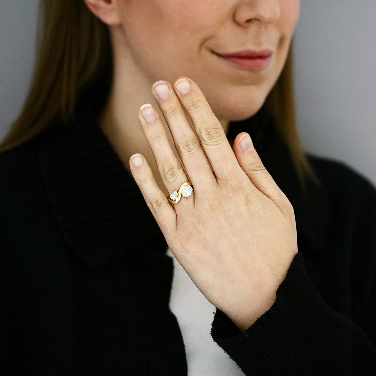A sculptural expression of modern elegance, this wave ring is designed to flow effortlessly around the finger with a sense of movement and balance. Crafted in luminous 9K yellow gold, the fluid band curves gracefully to showcase two exceptional IGI-certified diamonds in a striking asymmetrical composition.