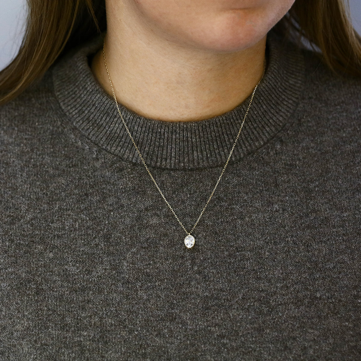 Elegant and contemporary, this diamond necklace features a stunning 3.01ct oval-shaped lab grown diamond, graded E colour and VVS2 clarity for exceptional brilliance and purity. The sleek bezel setting frames the stone with clean lines, enhancing its graceful elongated silhouette while offering a secure and modern finish.