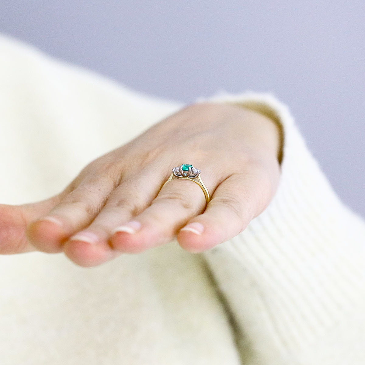 Celebrate timeless elegance with this refined three-stone ring, centred around a vibrant 0.40ct Zambian emerald. Known for their rich, velvety green hues, Zambian emeralds are prized for their exceptional clarity and depth of colour and this gemstone showcases these qualities beautifully.