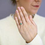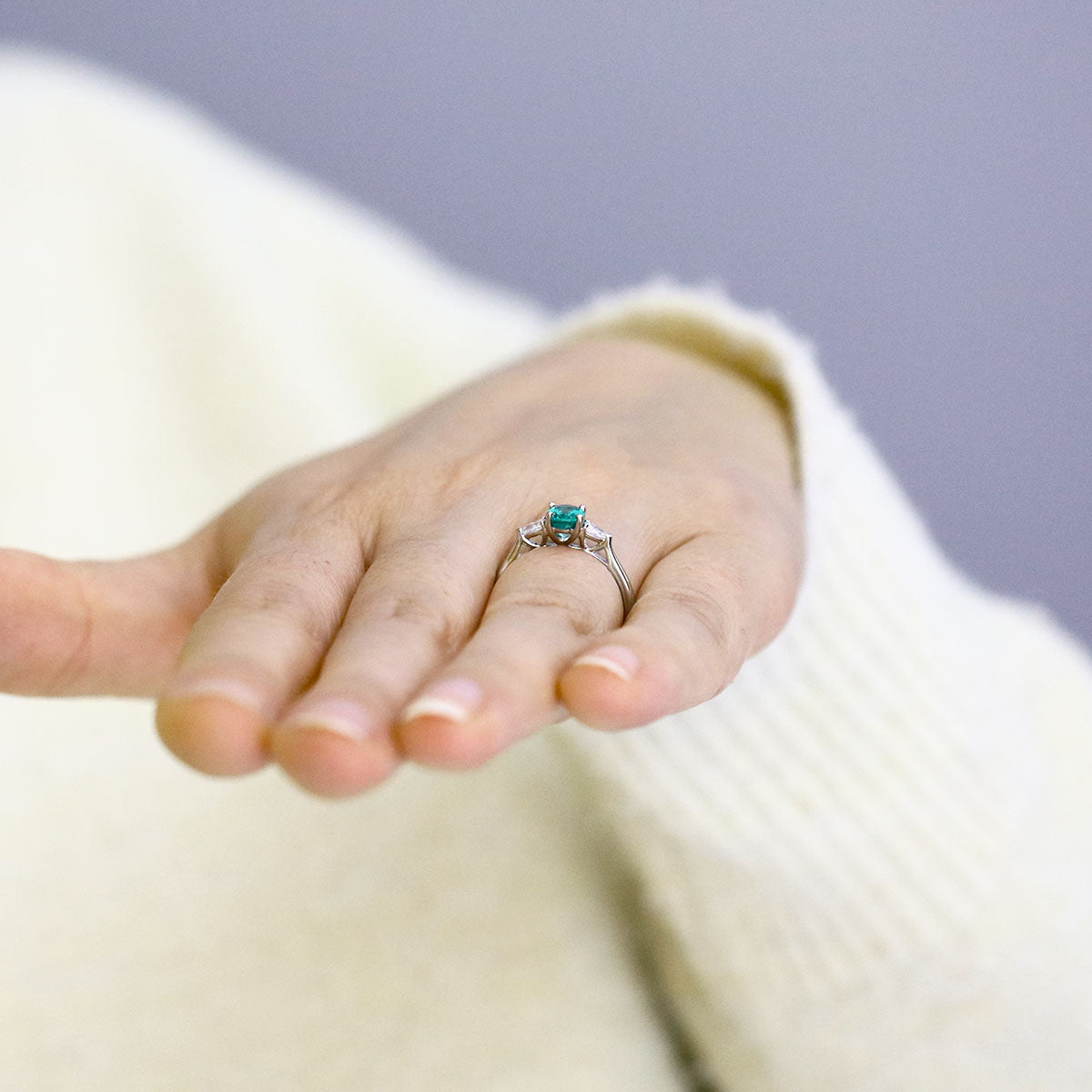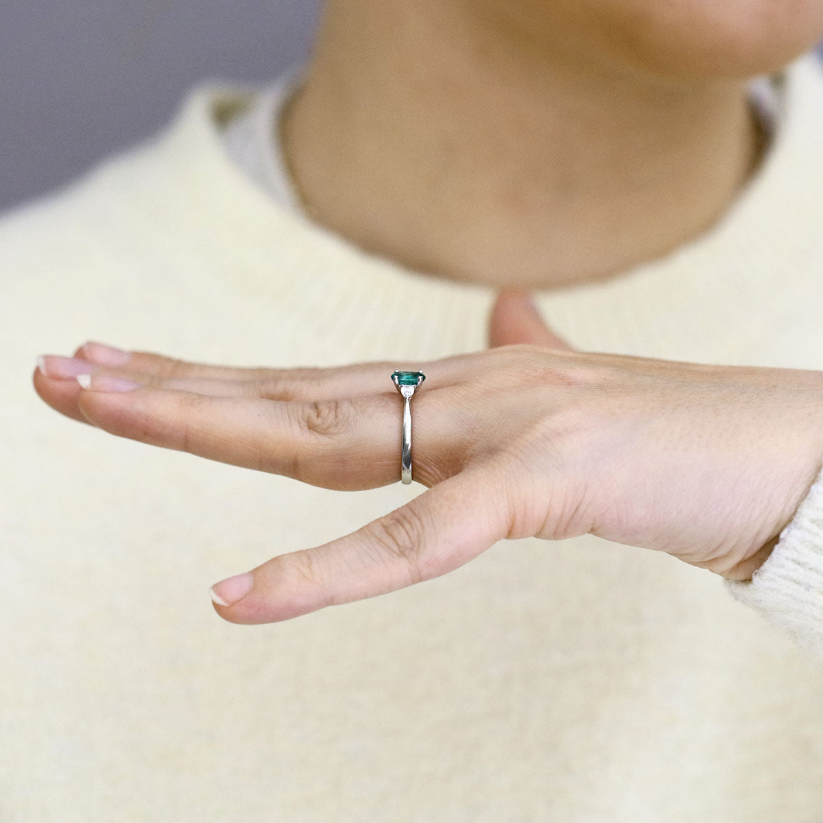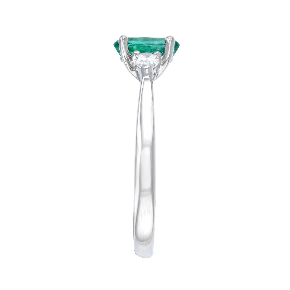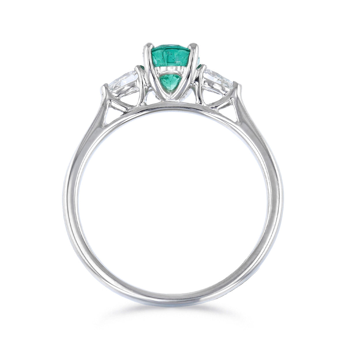 This elegant three-stone ring showcases a 0.73ct Zambian emerald, its vivid green colour highlighted by 0.20ct pear-cut diamonds gracefully set to either side. With G/H colour and SI1/SI2 clarity, the diamonds add subtle brilliance, perfectly complementing the emerald’s natural glow.