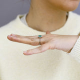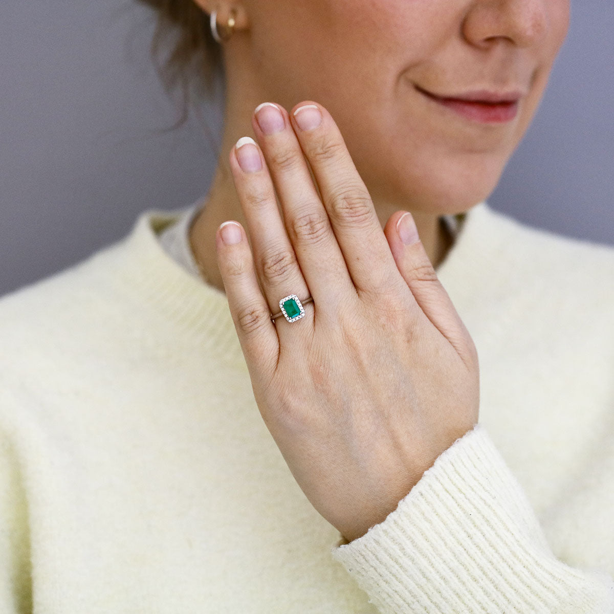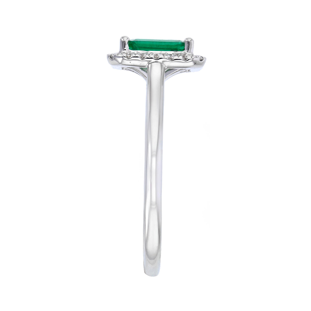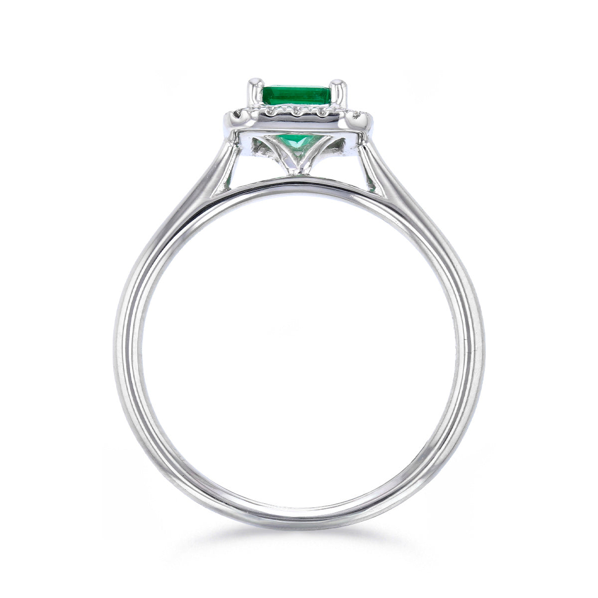 This striking ring features a 0.76ct emerald-cut Zambian emerald, admired for its rich green colour and beautifully clean lines. Surrounding the centre stone is a 0.14ct halo of diamonds, graded G/H colour and SI clarity, adding a refined brilliance that complements the emerald’s depth.