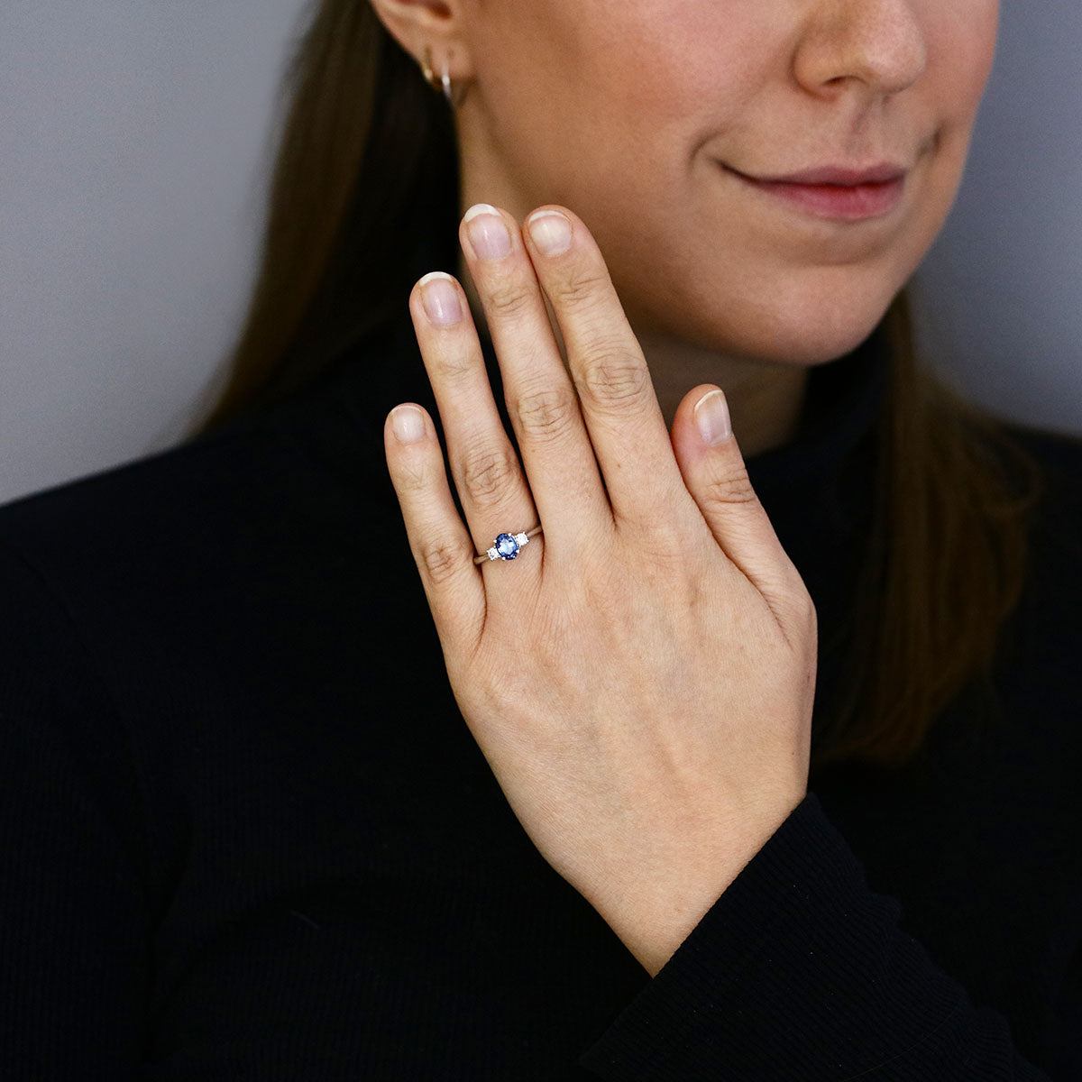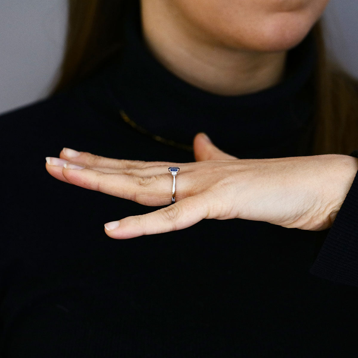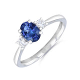Elegant and timeless, this three-stone ring showcases a 0.87ct oval-cut blue sapphire, prized for its deep, velvety hue and captivating brilliance. The centre stone is perfectly complemented by 0.21ct of round brilliant-cut diamonds (total), graded G/H colour and VS2/SI1 clarity, offering a bright, refined sparkle that enhances the sapphire’s rich tone.