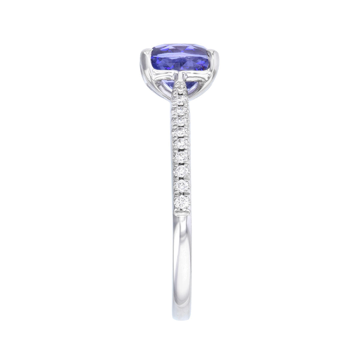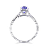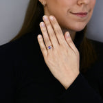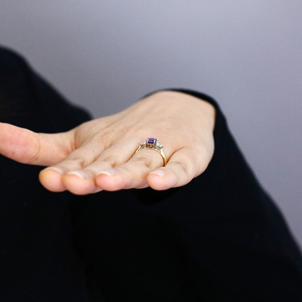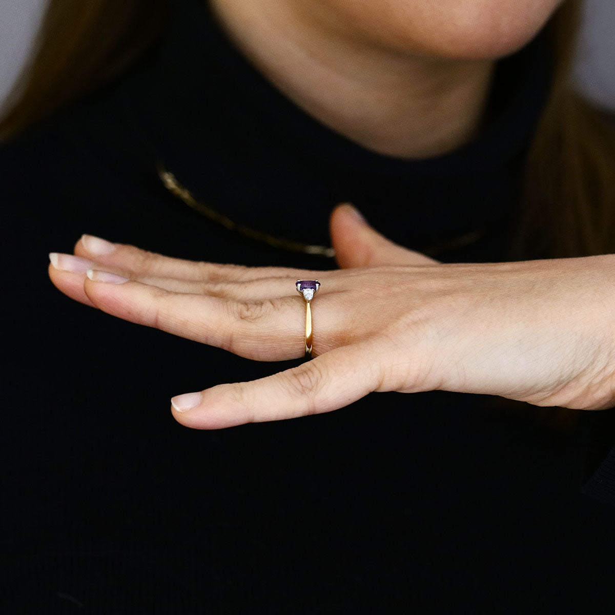 A captivating 1.12ct oval purple sapphire takes centre stage in this elegant three-stone ring, flanked by 0.29ct pear-cut diamonds on either side. The diamonds, graded G/H colour and VS2/SI1 clarity, add brilliance that beautifully complements the purple sapphire’s rich, vibrant hue.