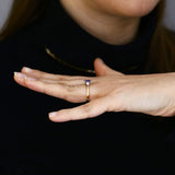 The ring features a yellow gold shank paired with a platinum setting, blending warm and cool tones for a sophisticated, contemporary finish. Presented in size M, it can be resized up or down by three sizes complimentary for a perfect fit.