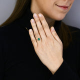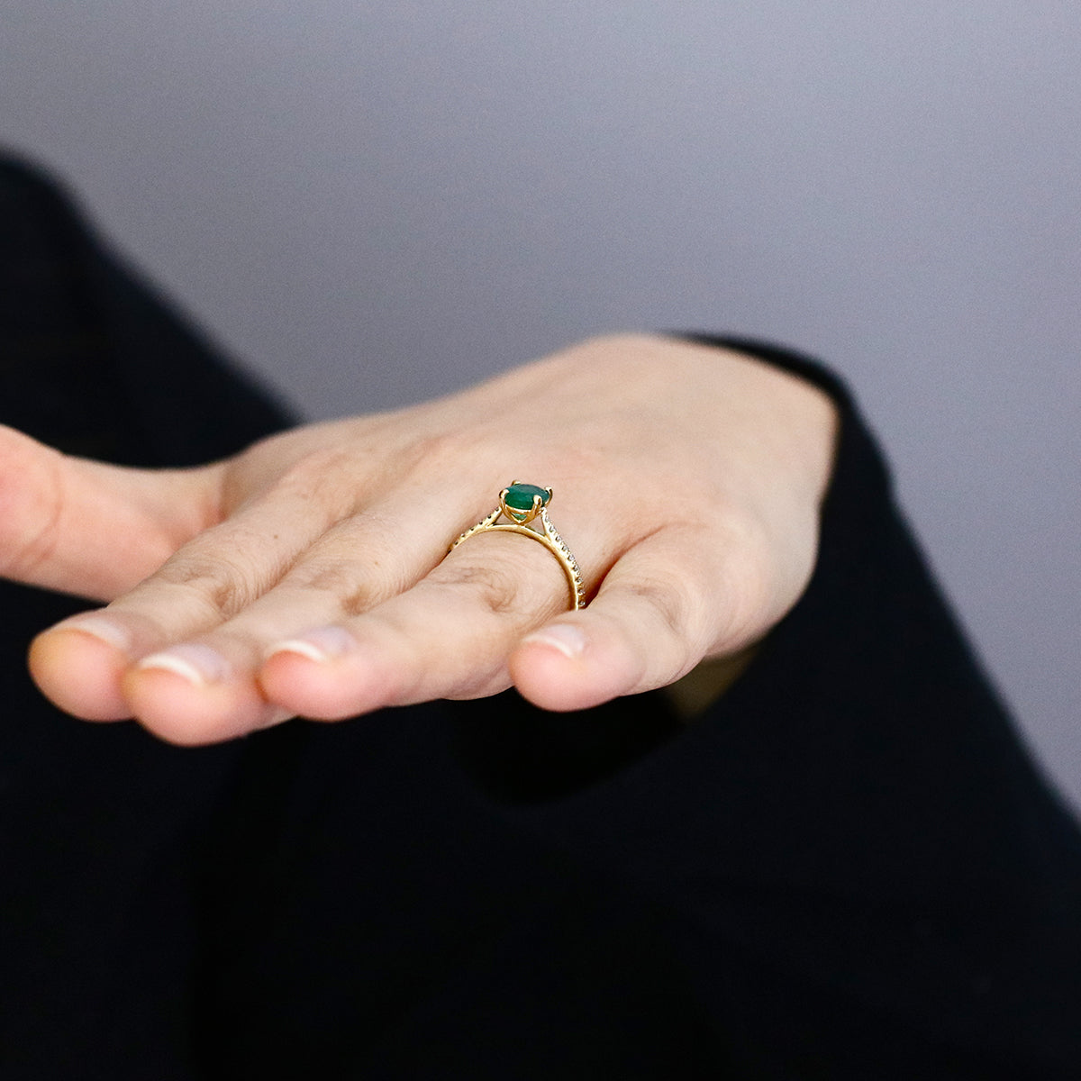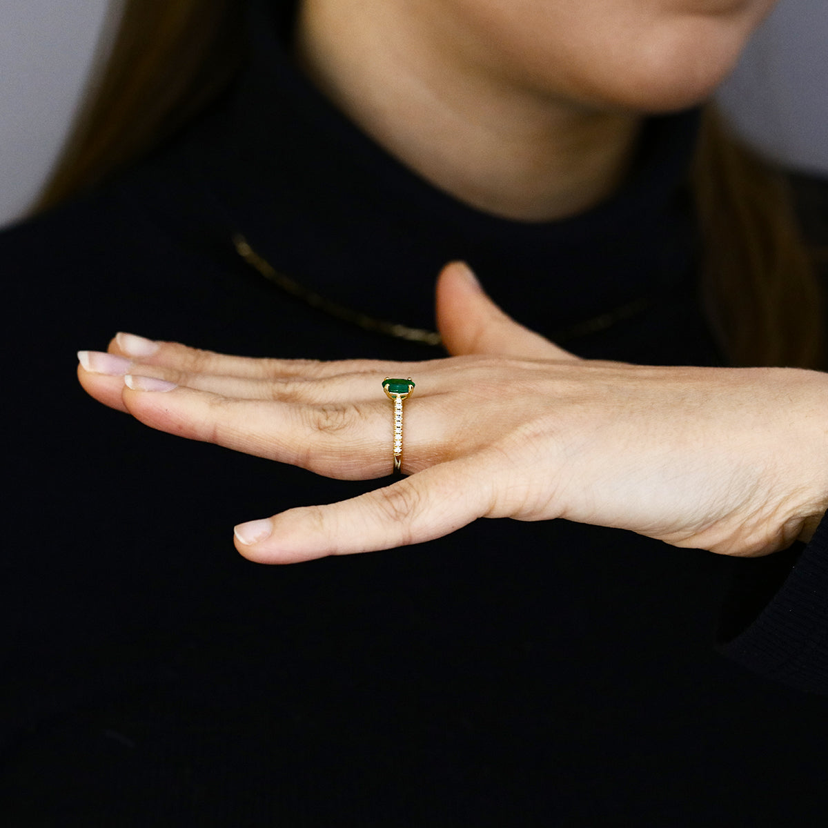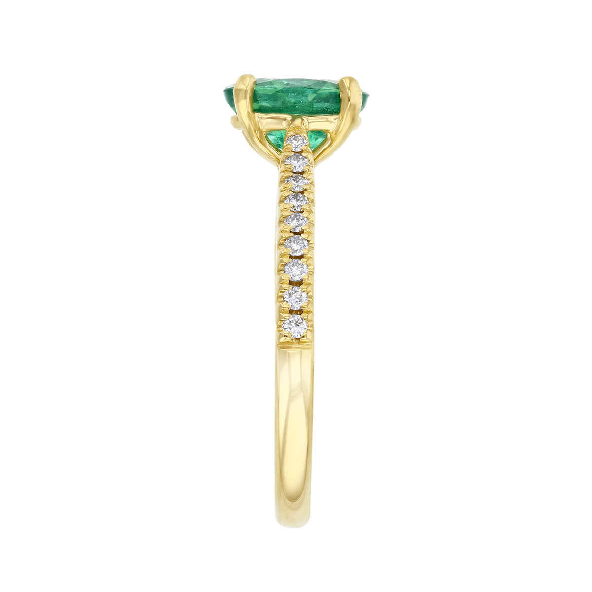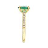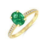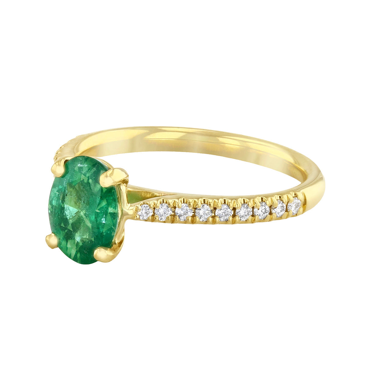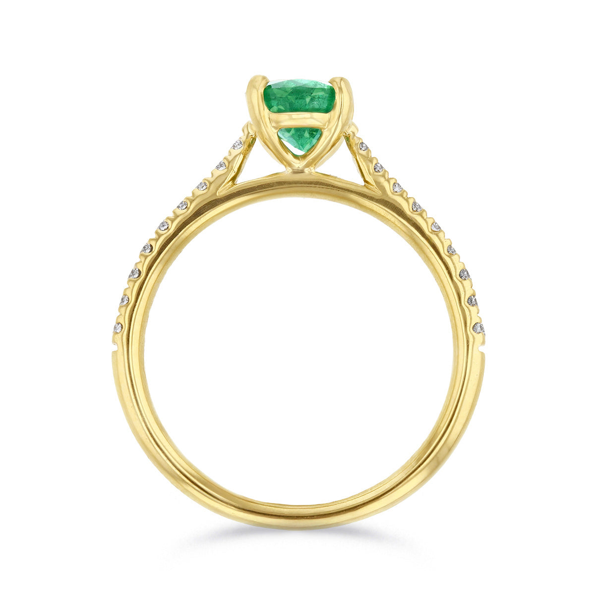 Crafted in 18K yellow gold, our Ophelia setting celebrates timeless elegance with a modern, refined silhouette. At its centre sits a 1.14ct oval emerald, chosen for its rich colour and luminous depth. The gemstone is framed by 0.17ct of sparkling diamond shoulders, adding a graceful brilliance to each side.