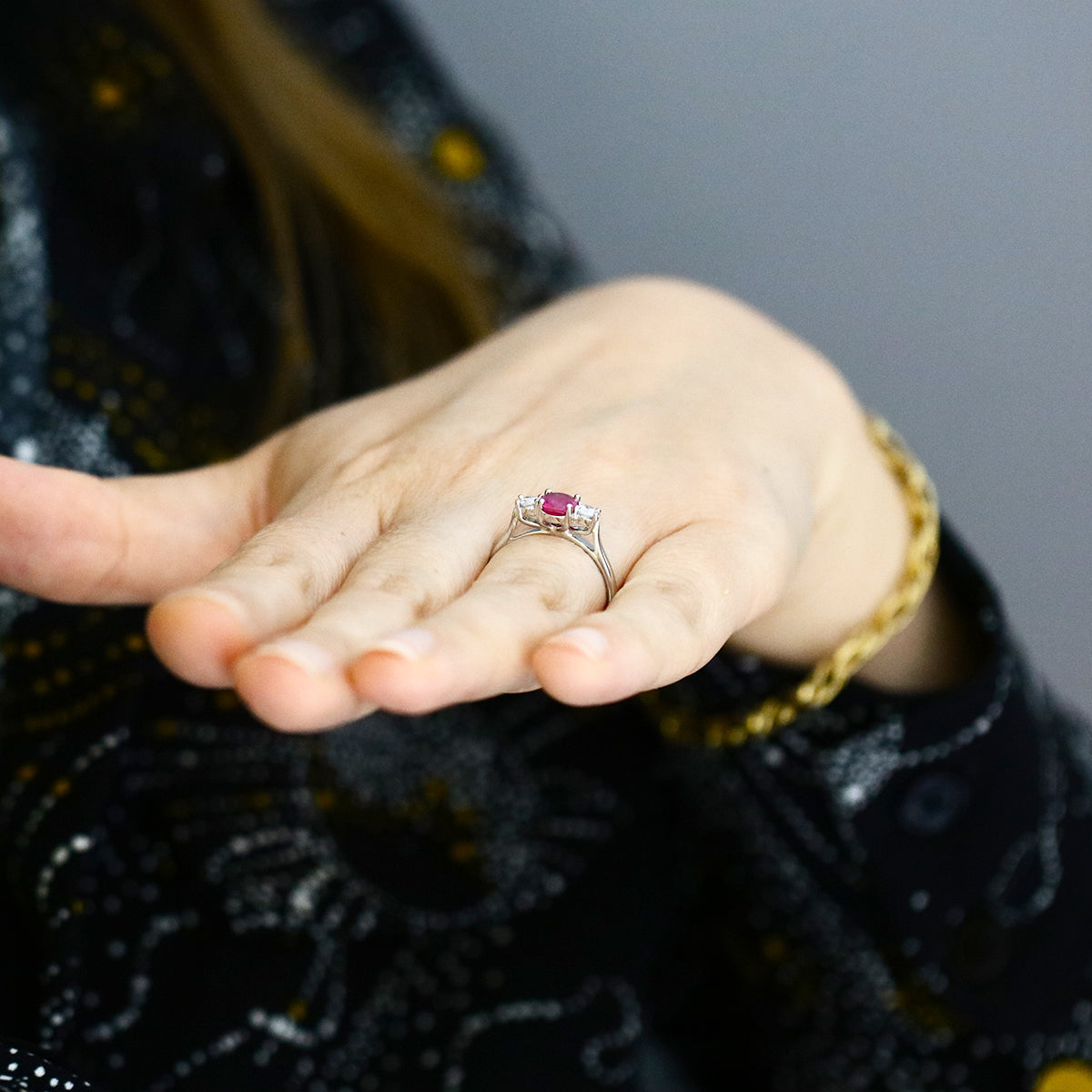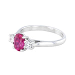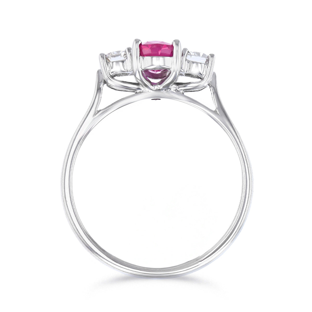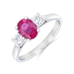 A striking celebration of colour and brilliance, this 1.20ct oval ruby is beautifully flanked by two sparkling diamonds totaling 0.23ct, crafted in luxurious platinum. The diamonds feature H/I colour and SI1/SI2 clarity, perfectly enhancing the ruby’s rich, vibrant hue.