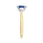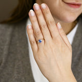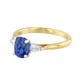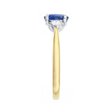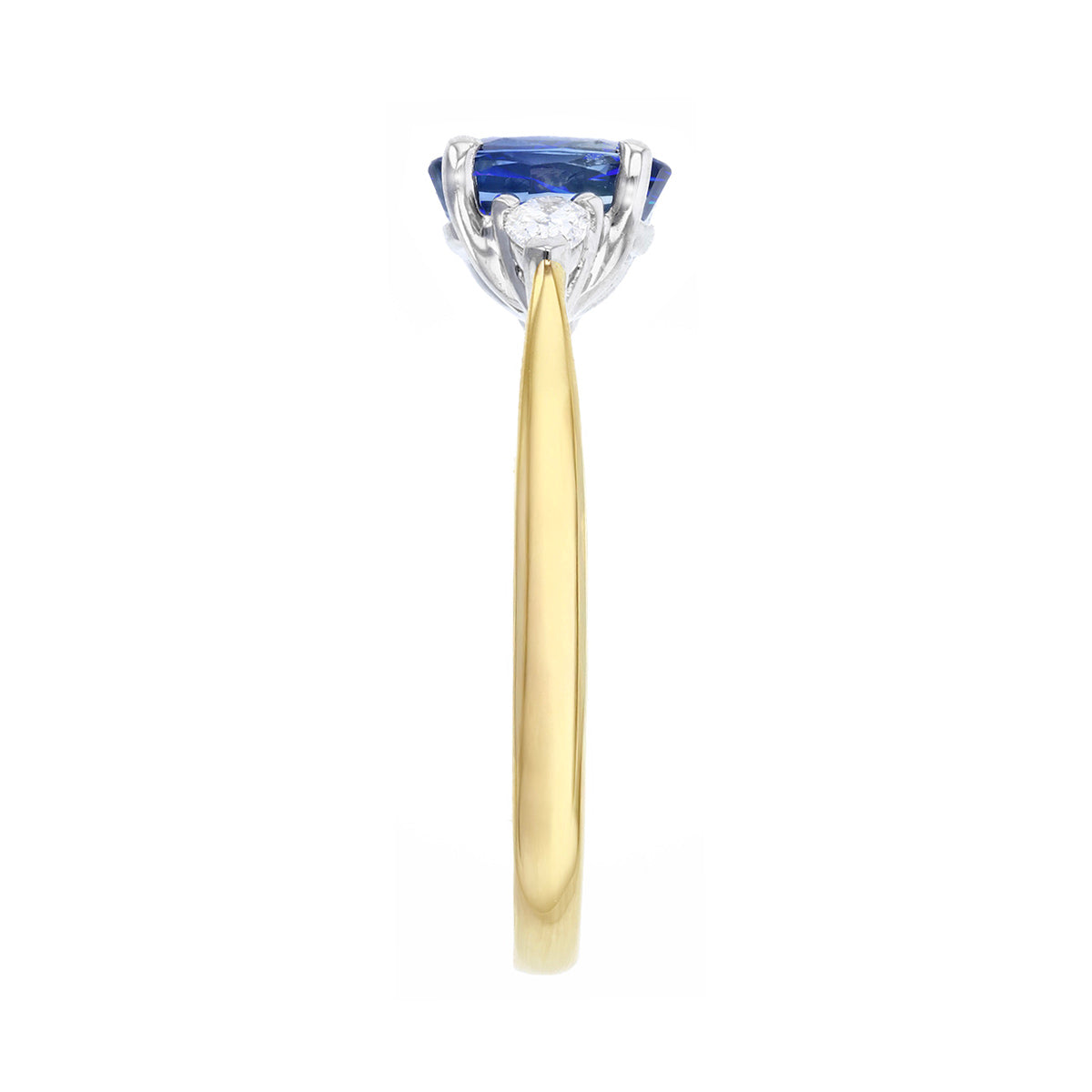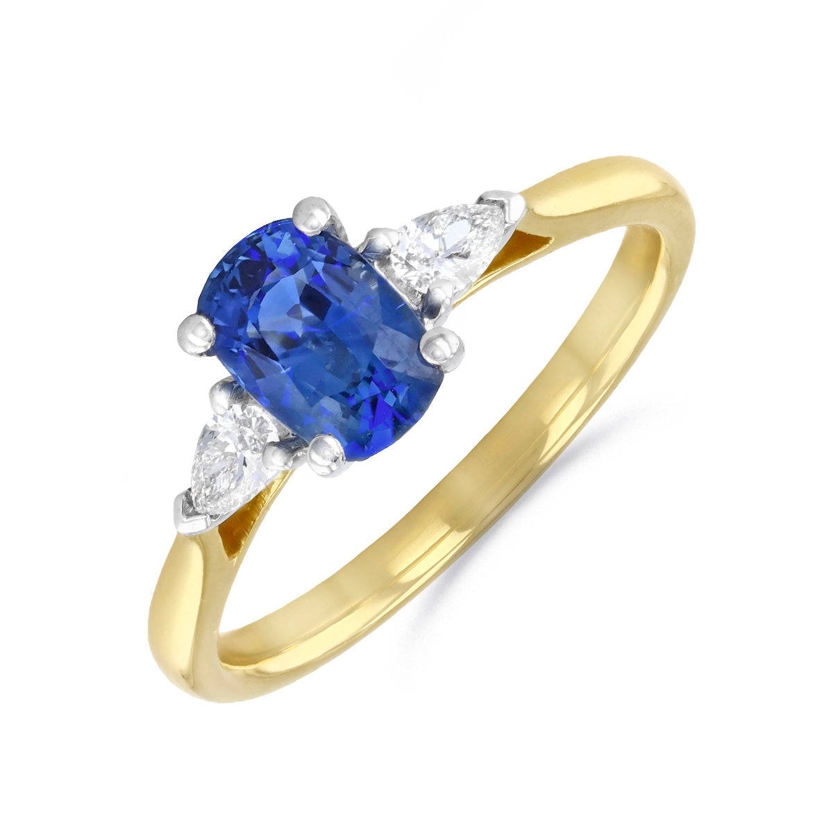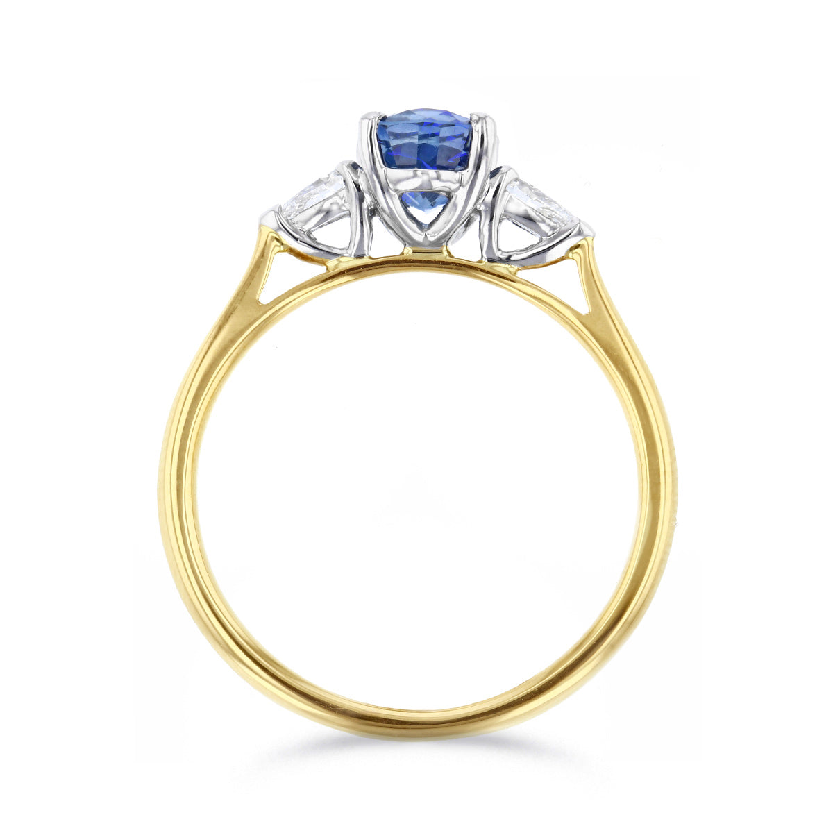 A timeless three-stone design, this ring features a striking 1.29ct elongated cushion-cut blue sapphire at its centre, framed by two sparkling pear-cut diamonds totalling 0.18ct (G/H colour, VS2/SI1 clarity). The vivid sapphire is set in platinum for maximum brilliance, while the 18K yellow gold shank provides a warm, classic contrast.