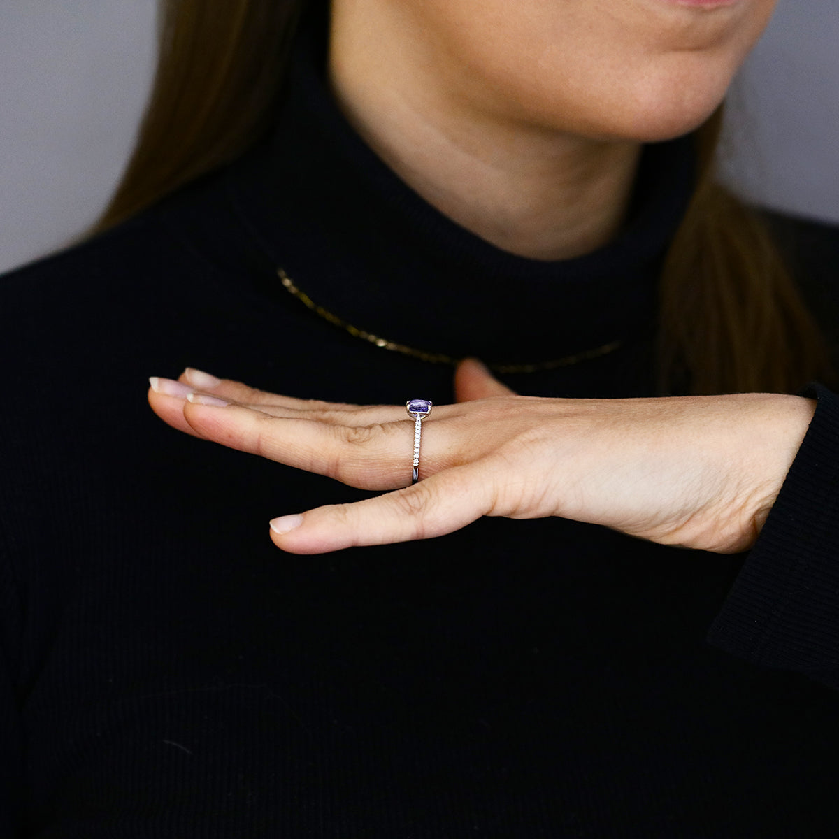 The signature beauty of our Ophelia design is elevated with a luminous 1.60ct cushion-cut lilac sapphire, glowing with ethereal pastel tones. The centre stone is gracefully accented by 0.13ct of brilliant-cut diamond shoulders, adding a whisper of sparkle that enhances the sapphire’s colour.