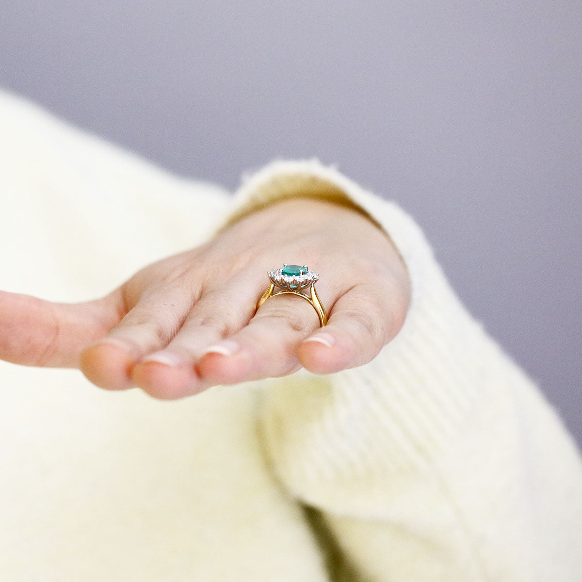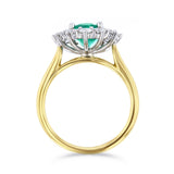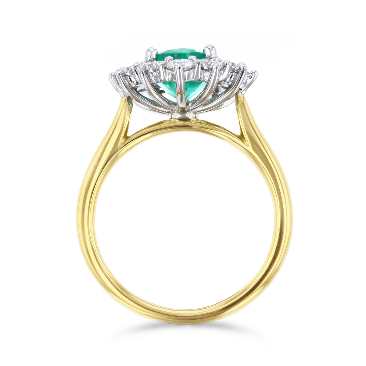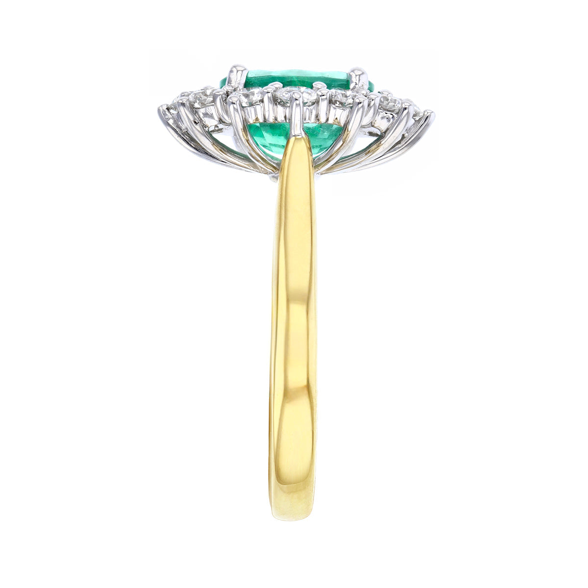 A striking statement of elegance, this ring features a 1.96ct oval emerald at its centre, surrounded by a cluster of 0.87ct brilliant-cut diamonds that enhance its vibrant green glow. The interplay of warm 18k yellow gold and sleek 18k white gold setting creates a modern yet timeless contrast, highlighting the craftsmanship of every detail.