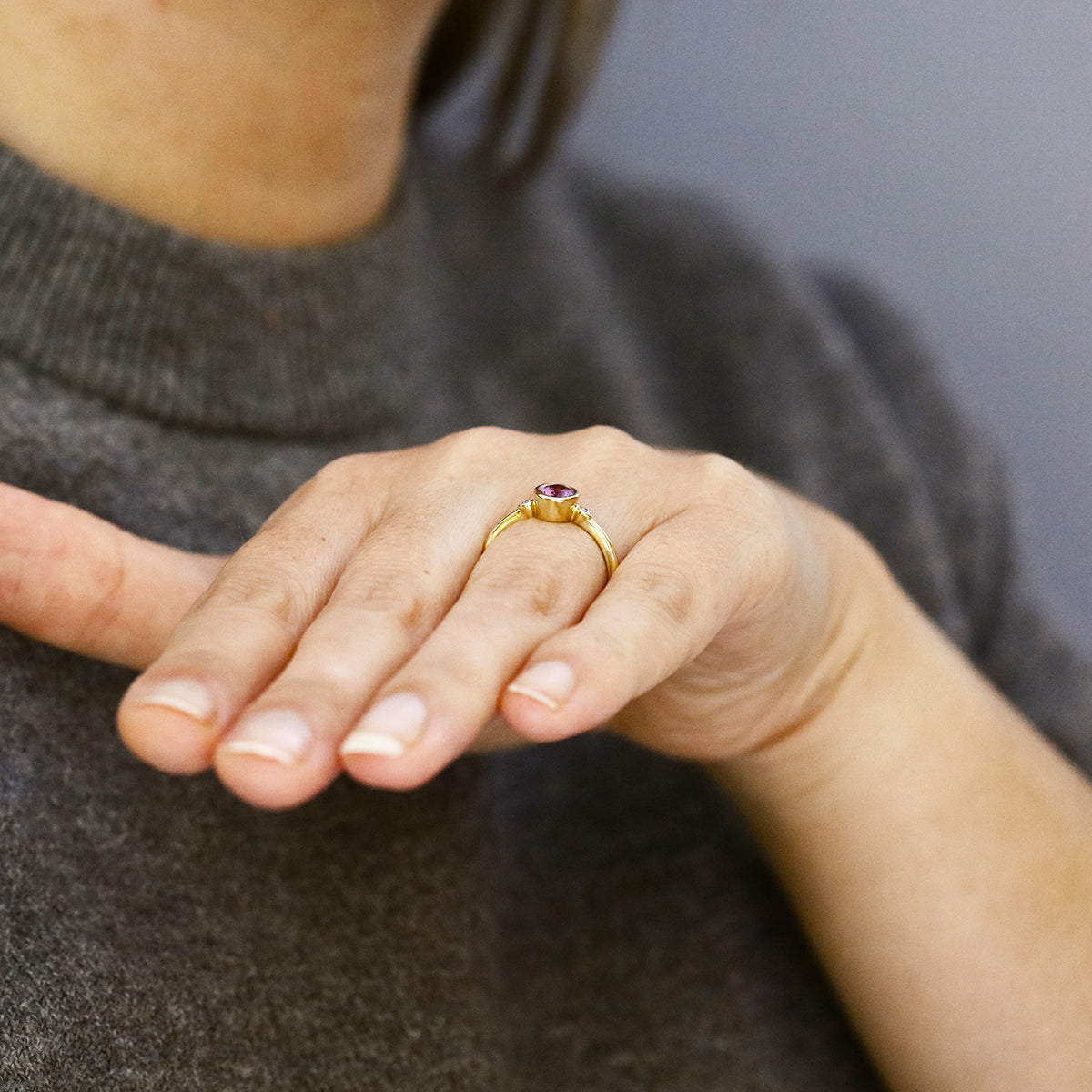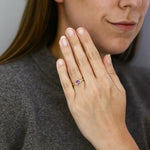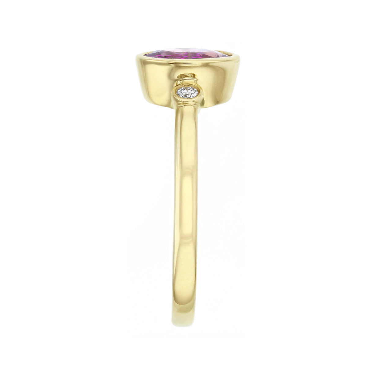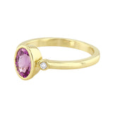 Delicate yet striking, this refined design centres on a beautiful 7.1 x 5.1mm oval pink sapphire, radiating a soft, feminine hue that symbolises love and elegance. The sapphire is securely embraced in a sleek bezel setting, its smooth edges lending a contemporary finish while highlighting the stone’s natural brilliance.
