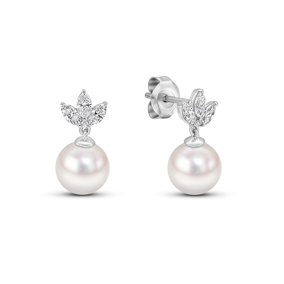 Matt Aminoff Navette Collection Akoya 8x8.5mm Pearl & Diamond Studs | 18K White Gold