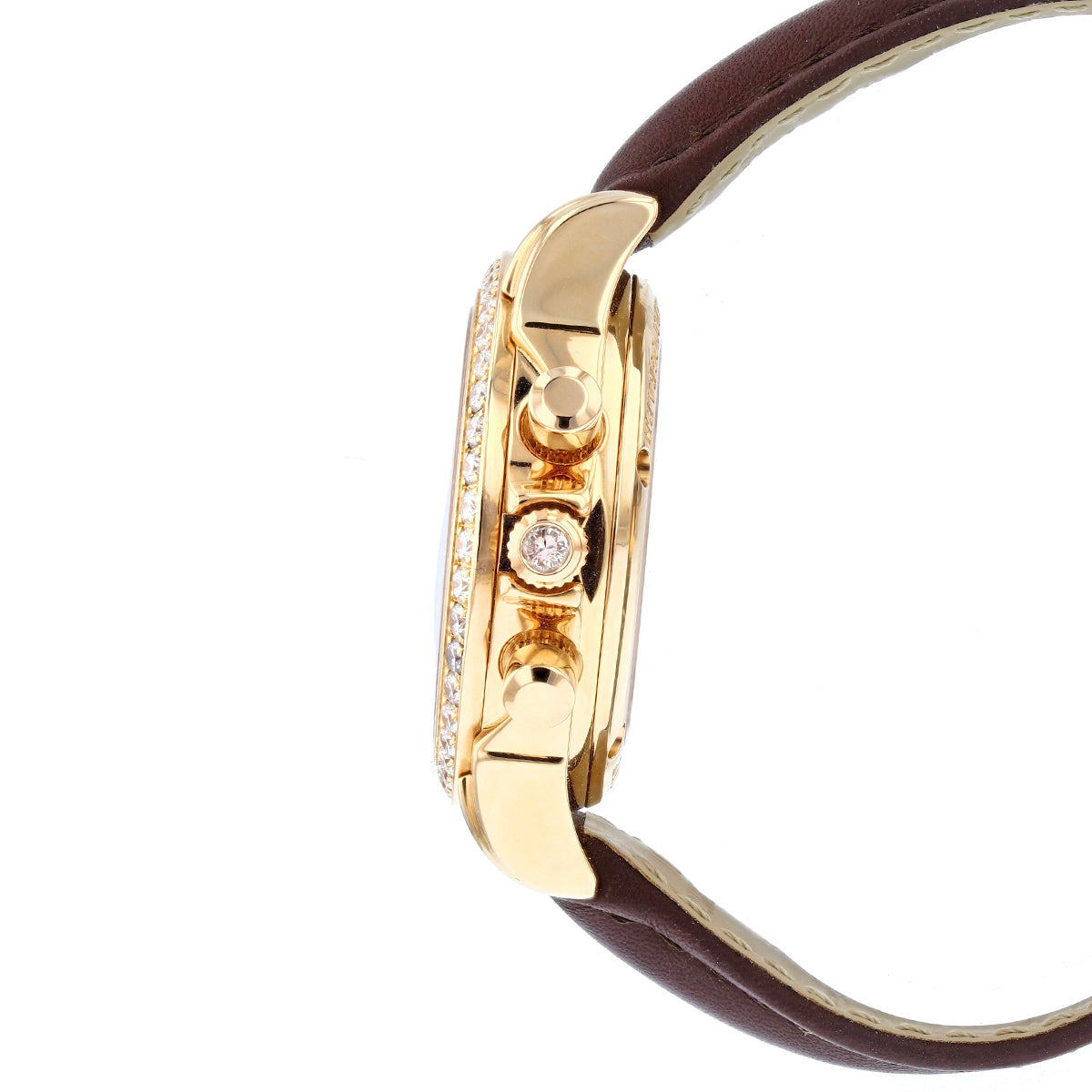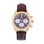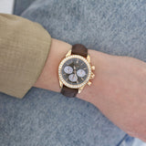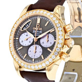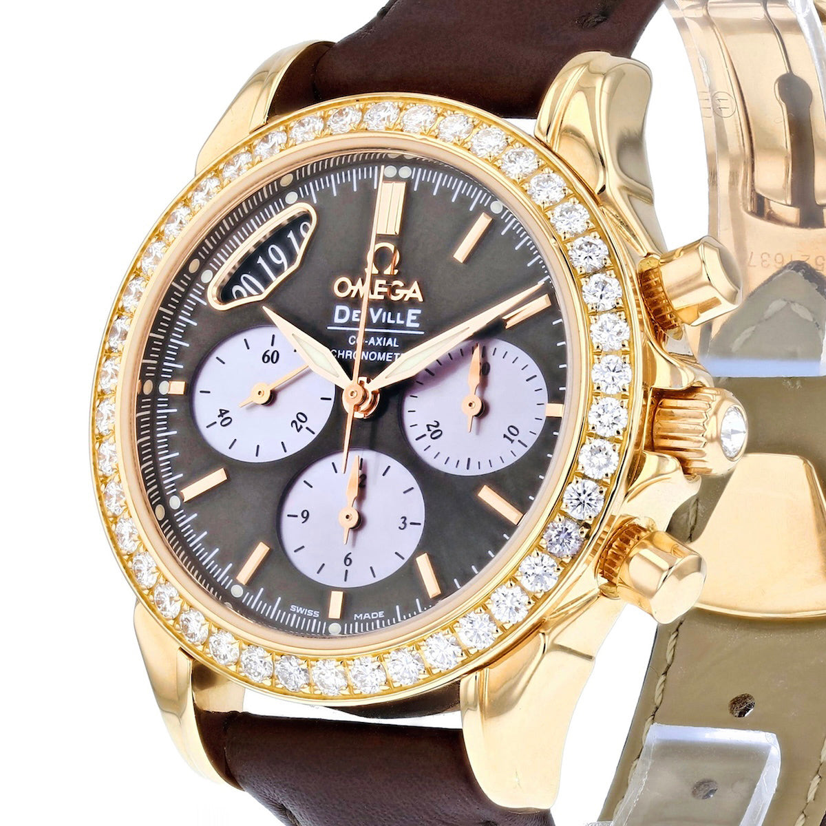 Crafted in 18ct rose gold, the 34mm case offers a warm, feminine presence on the wrist, perfectly balanced by a rich brown leather strap. The bezel is adorned with brilliant-cut diamonds, adding a radiant halo of sparkle that elevates the classic De Ville silhouette.