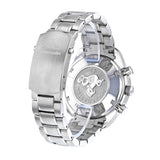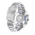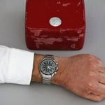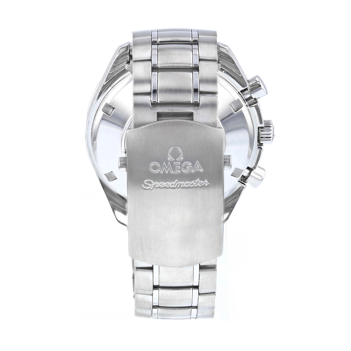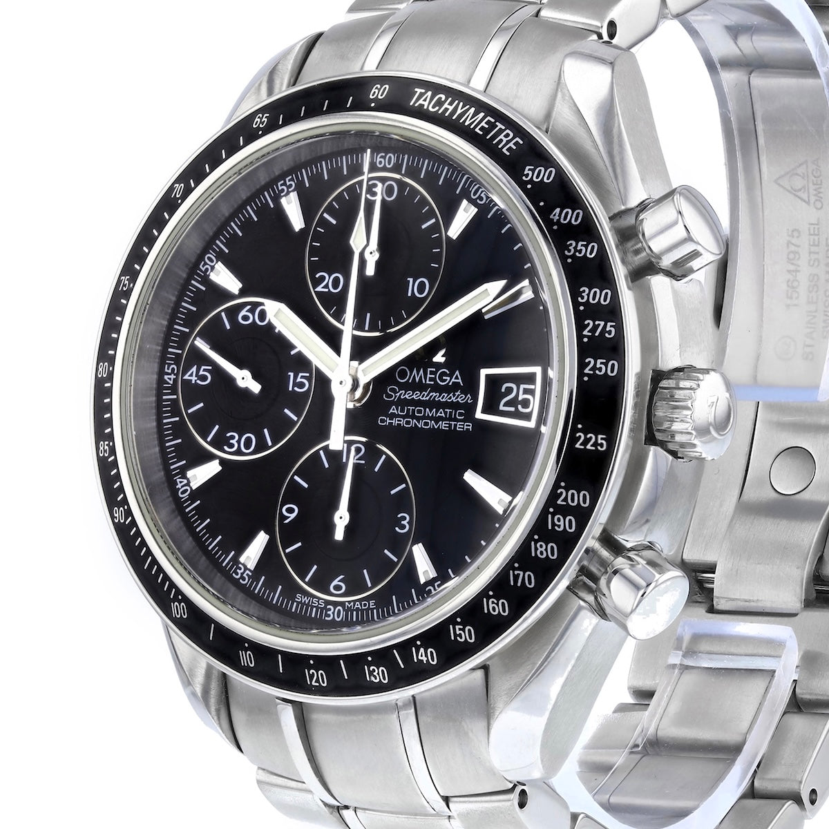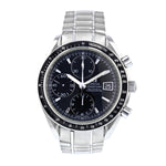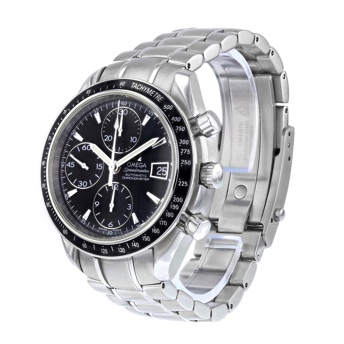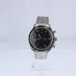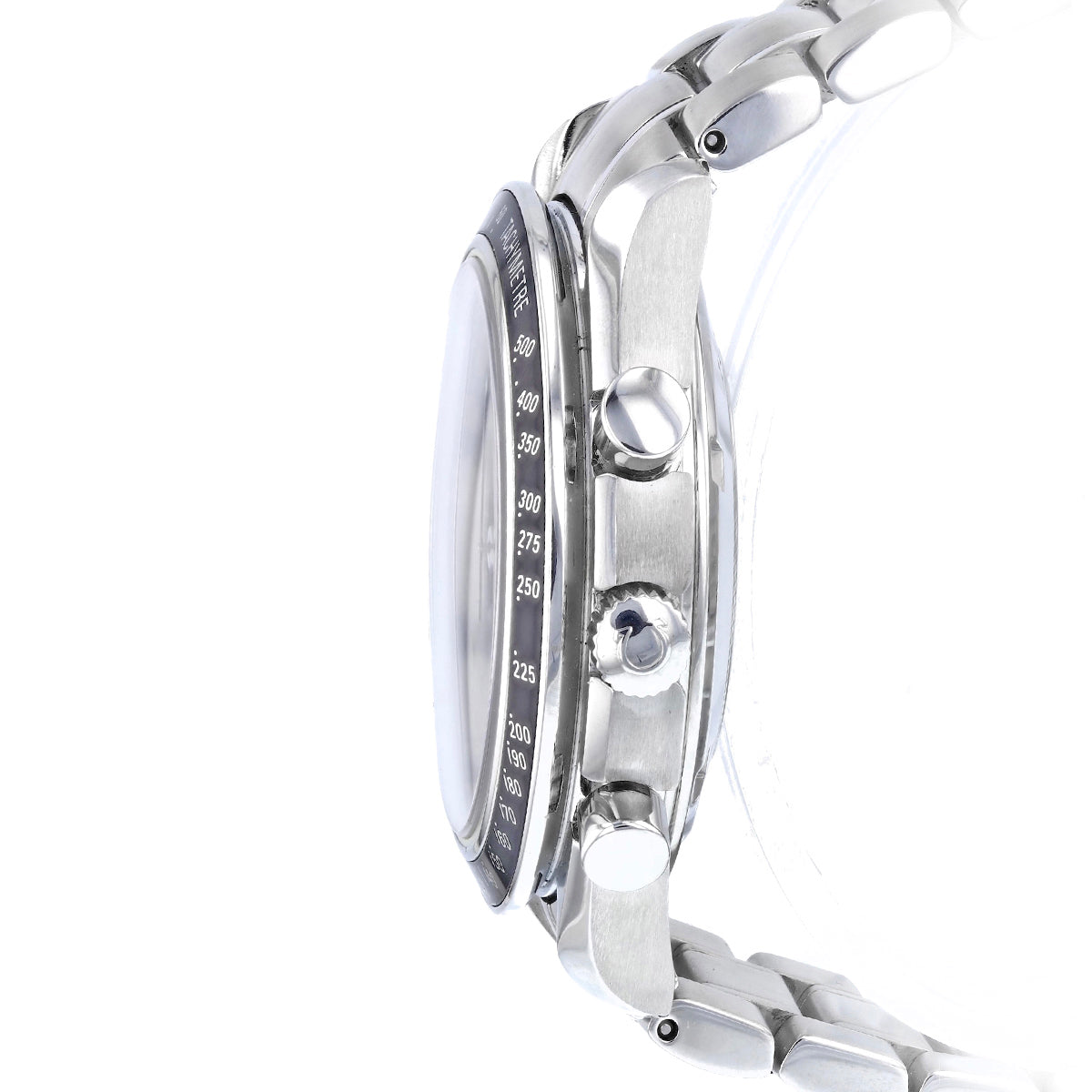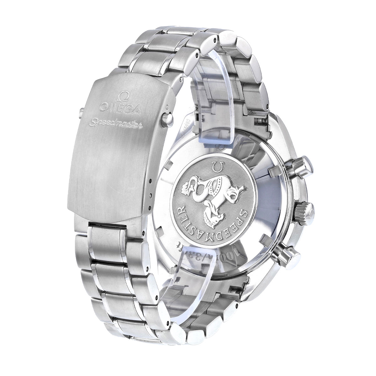 This Omega Speedmaster is crafted from stainless steel and features a black dial with luminous index, a date display at 3 o’clock, and three chronograph sub-dials. The 40mm case is paired with a fixed tachymetric scale bezel, adding a touch of precision to its design. The watch is presented on a stainless steel bracelet with a fold-over clasp for a secure and comfortable fit.