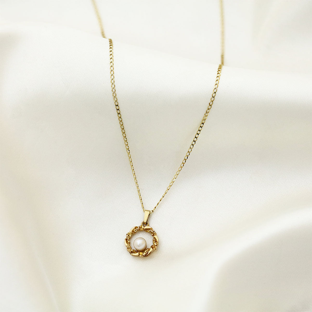 Delicate, elegant, and effortlessly versatile, this pre-loved necklace features a charming circular frame with a subtle twist, crafted from 9K yellow gold. Measuring approximately 14mm x 14mm, the open circular design is beautifully enhanced by a lustrous 5mm x 5mm pearl, adding a touch of classic sophistication.