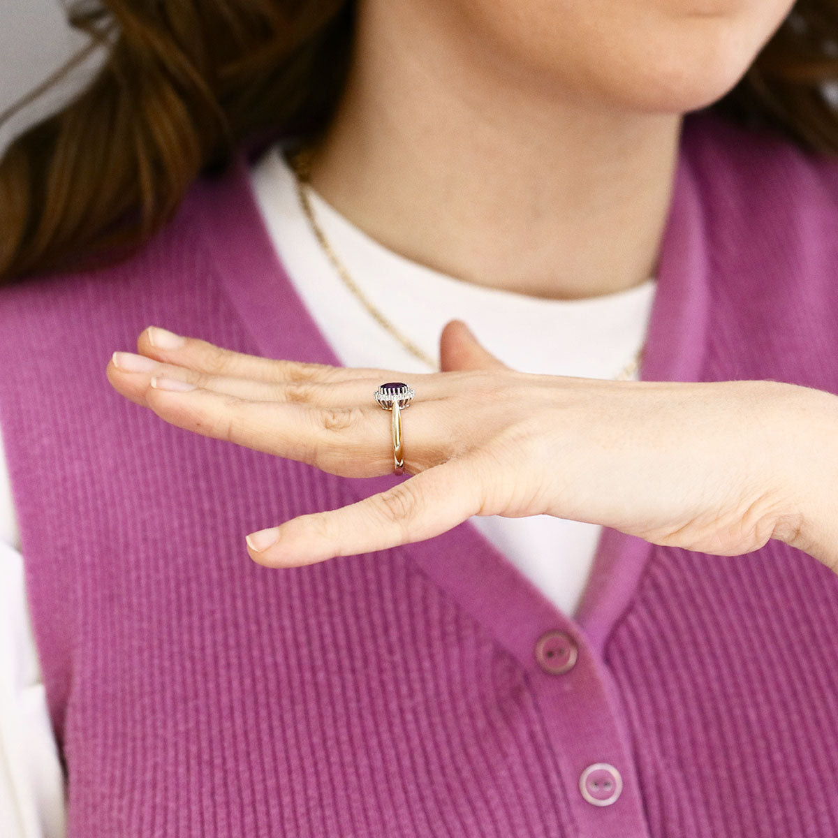 Celebrate timeless elegance with this beautiful oval amethyst and diamond cluster ring. At its heart sits a 7x5mm oval amethyst, radiating a rich, captivating hue, complemented by 0.18ct of sparkling diamonds that enhance its vintage charm. Each diamond is carefully selected for I/J colour and SI clarity, creating a harmonious shimmer around the central stone.