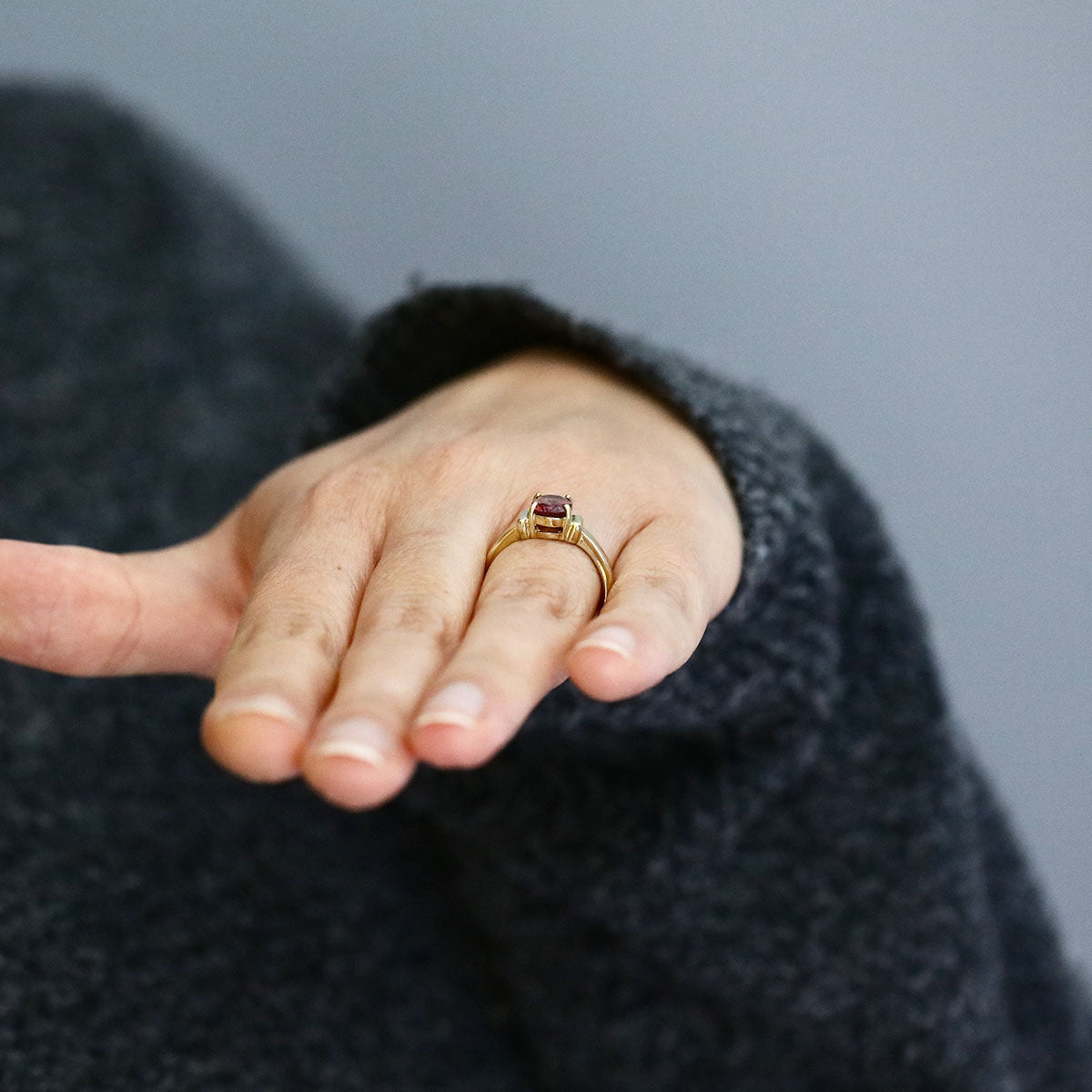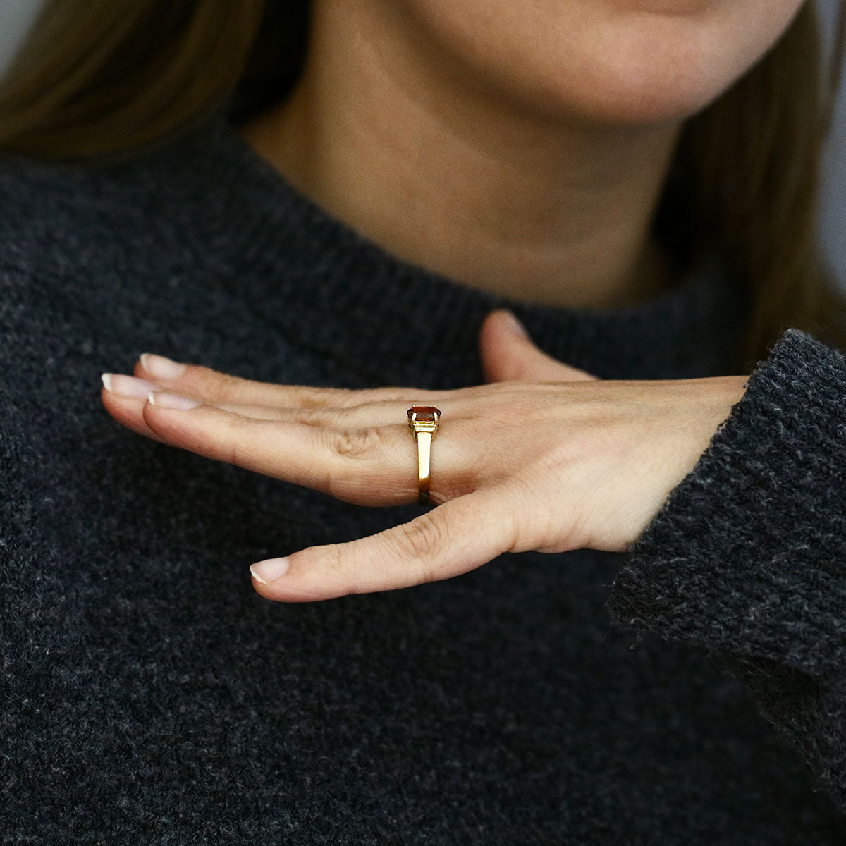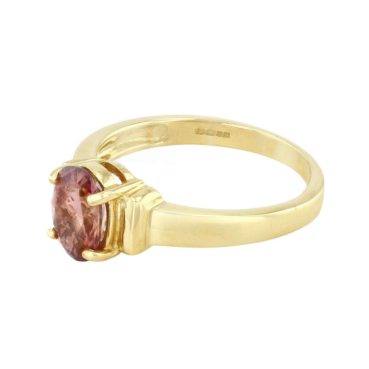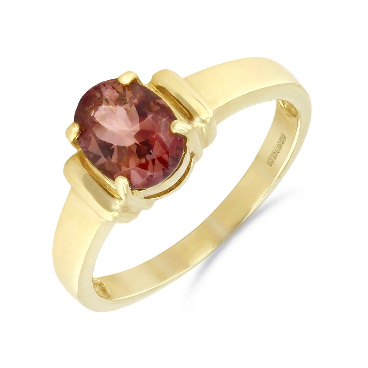 Elegant and timeless, this pre-loved dress ring features a rich oval-cut tourmaline, measuring approximately 6x5mm, held securely in a four-claw setting. The gemstone’s deep, warm hue is beautifully complemented by the 9K yellow gold band, designed with distinctive cuff-style detailing to either side of the central stone for a refined architectural touch.