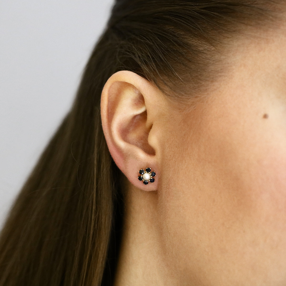 Delicately crafted in 9K yellow gold, these pre-loved earrings feature a charming flower design with a lustrous central pearl (4mm) surrounded by sparkling round-cut sapphires (2.5mm). The harmonious arrangement creates a timeless floral motif, measuring 19.5mm wide with a depth of 4.9mm. Perfectly combining elegance and colour, these earrings add a refined, classic touch to any collection.