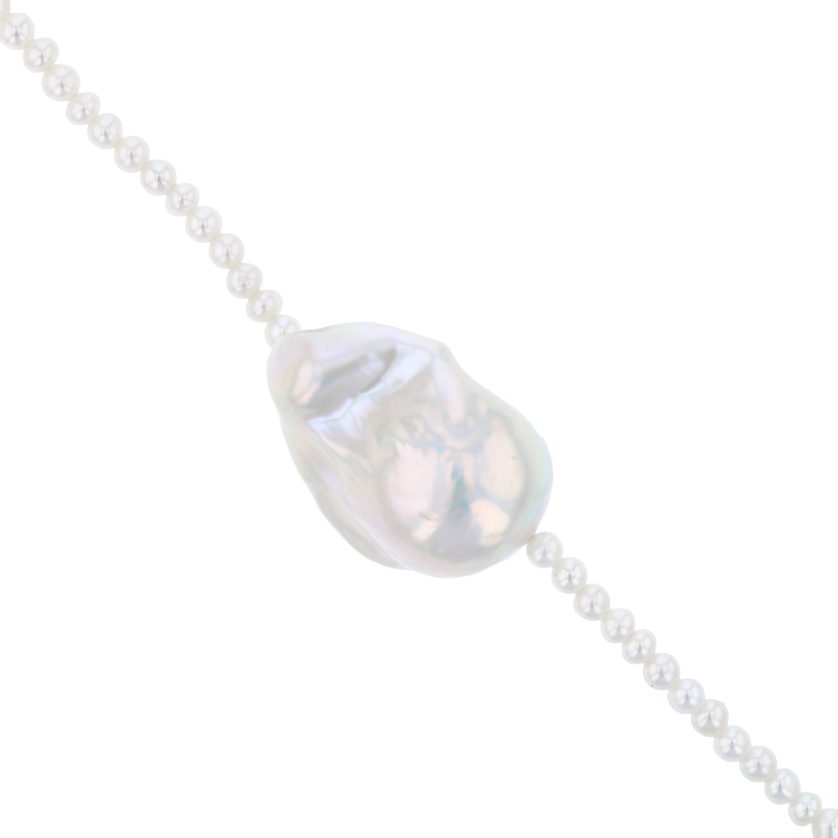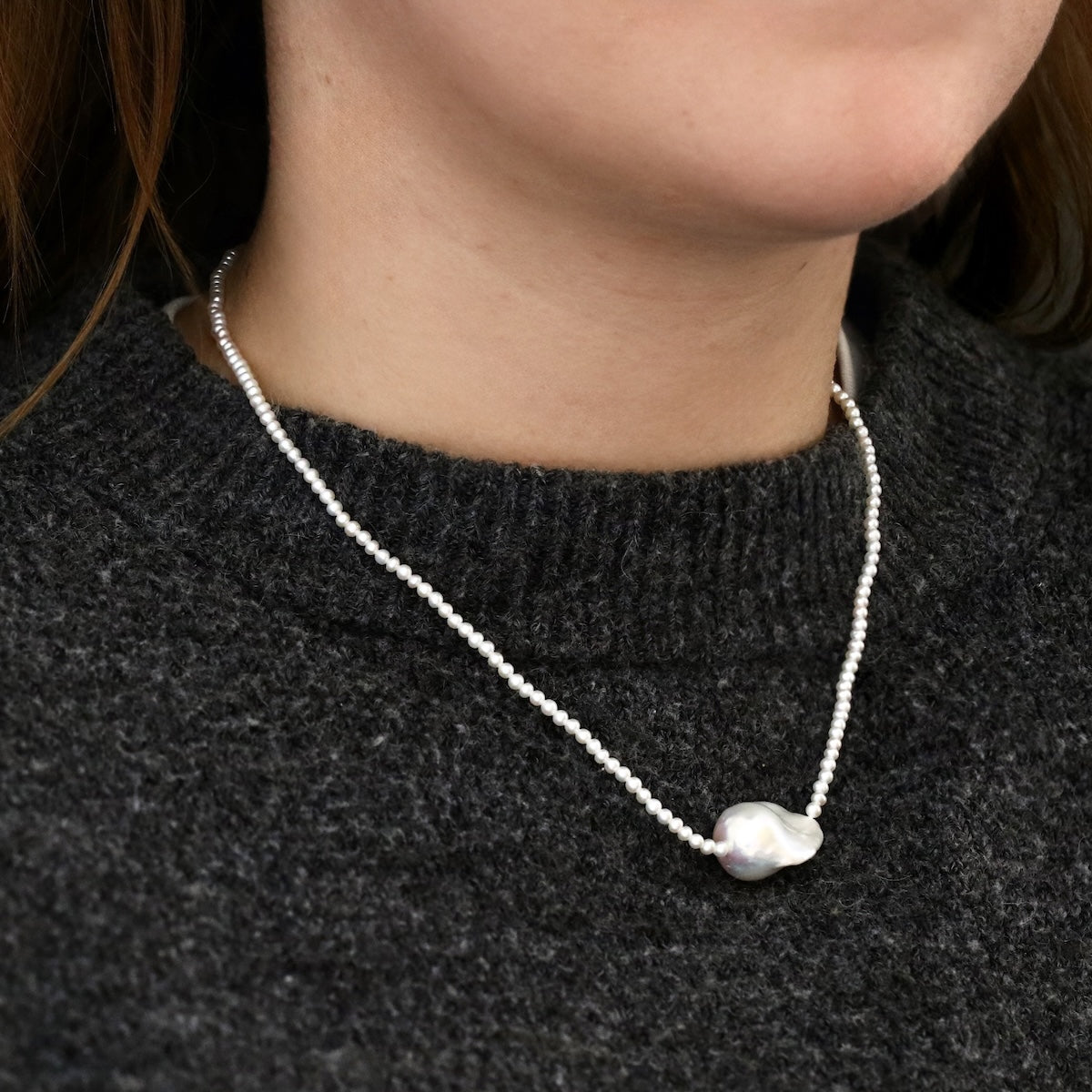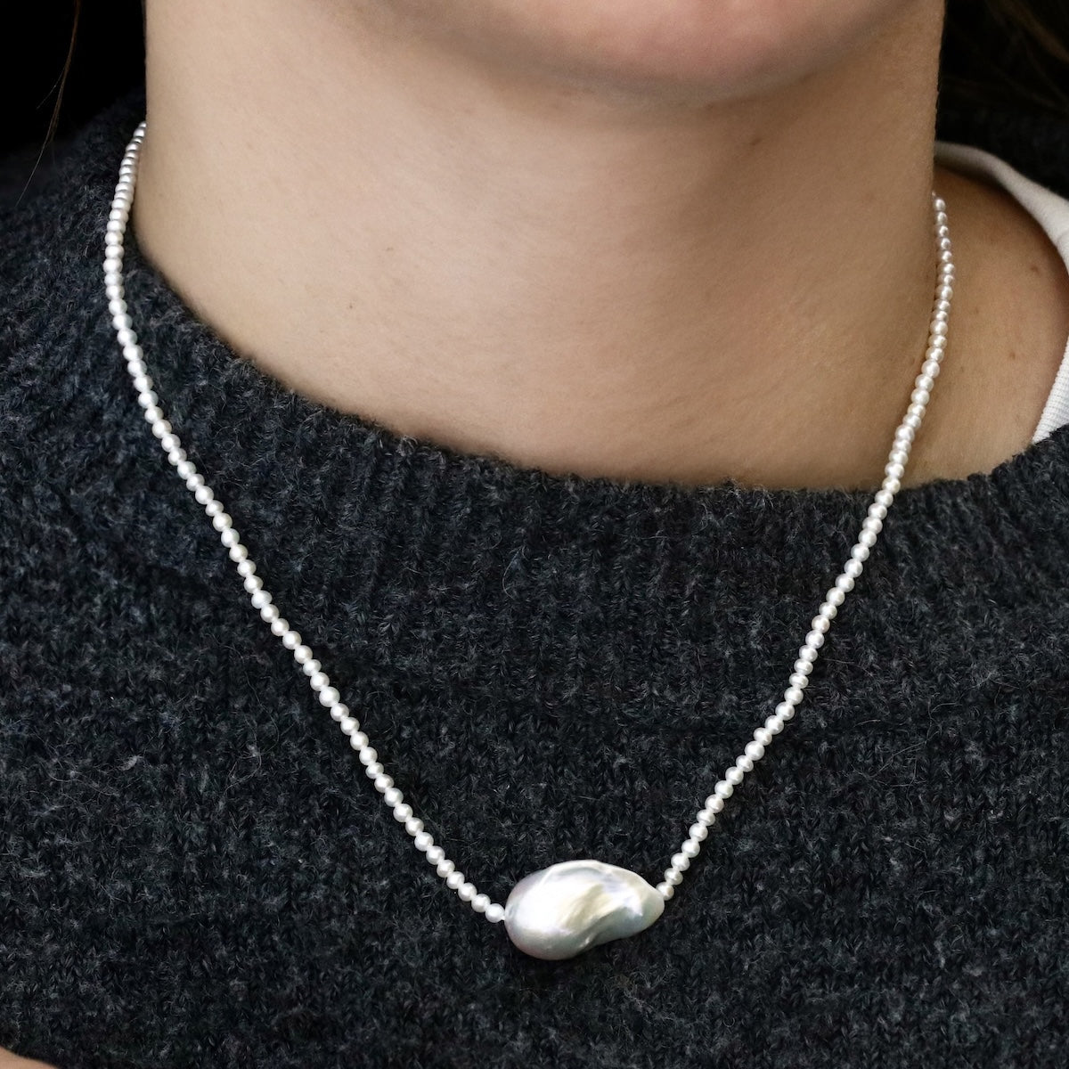 A modern classic with a touch of organic elegance, this necklace is strung with delicate 2–2.5mm white round pearls and finished with a striking baroque pearl centrepiece. The lustrous round pearls provide a refined backdrop, while the baroque pearl - celebrated for its sculptural, one-of-a-kind form becomes the captivating focal point of the design.