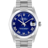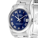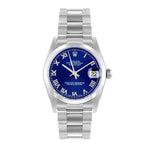 This Rolex Datejust 31 is crafted in Oystersteel and features a smooth bezel with a blue dial, applied Roman numeral index and a Cyclops lens date display at 3 o’clock. The watch is fitted to an Oyster bracelet with a folding Oysterclasp.