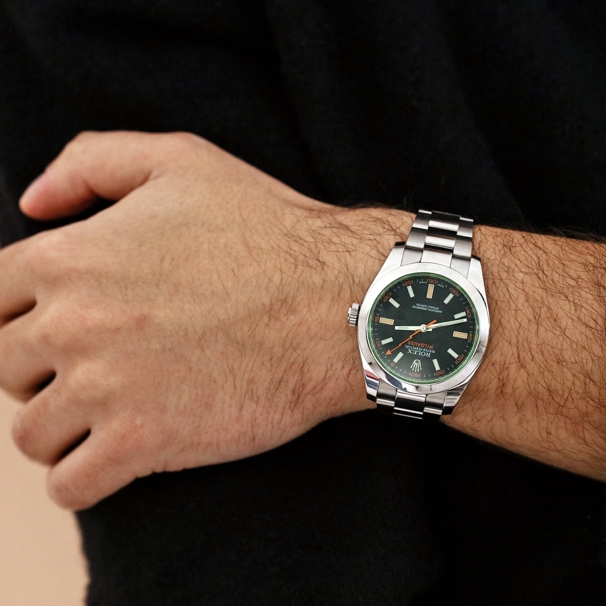 Translation to ‘a thousand gauss’ the Rolex Milgauss is dubbed the science watch, designed to resist magnetic fields through the Rolex patented Parachrom Blue Hairspring, an alloy designed to increase anti-magnetic properties. The distinctive green sapphire crystal and orange lightning bolt seconds hand was a first for the brand, making Milgauss a perfect addition to any watch collection.