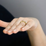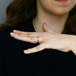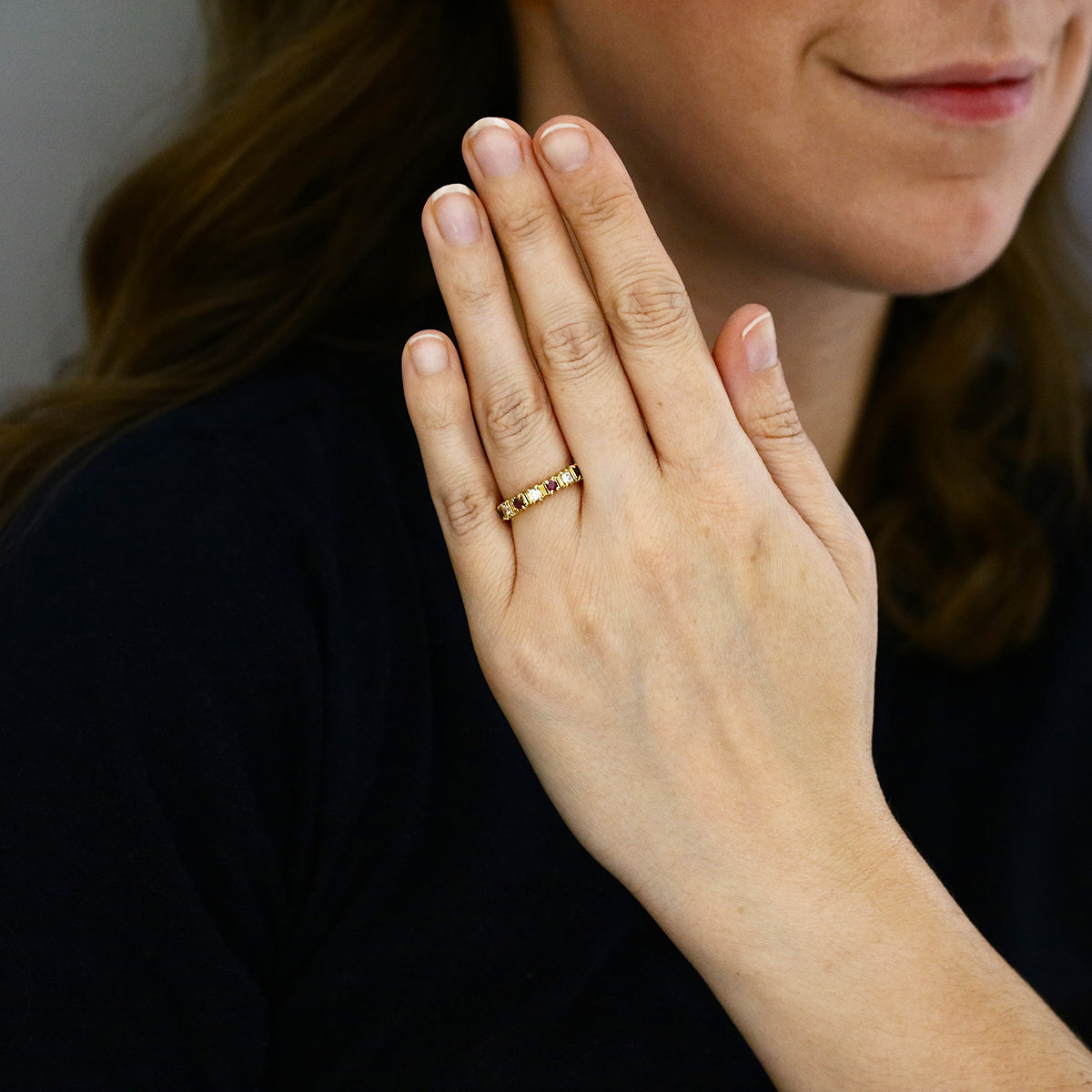 Delicate bar accents sit between each stone, adding visual rhythm and enhancing the ring’s elegant flow. The ridged shoulders bring a touch of vintage charm and subtle texture, giving the piece an elevated, artisanal feel.