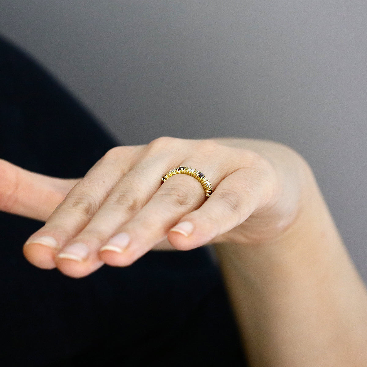 Beautifully made and fully hallmarked for 18K yellow gold, this half eternity ring is an ideal choice for stacking, marking a special milestone, or simply adding a timeless pop of colour to everyday wear.