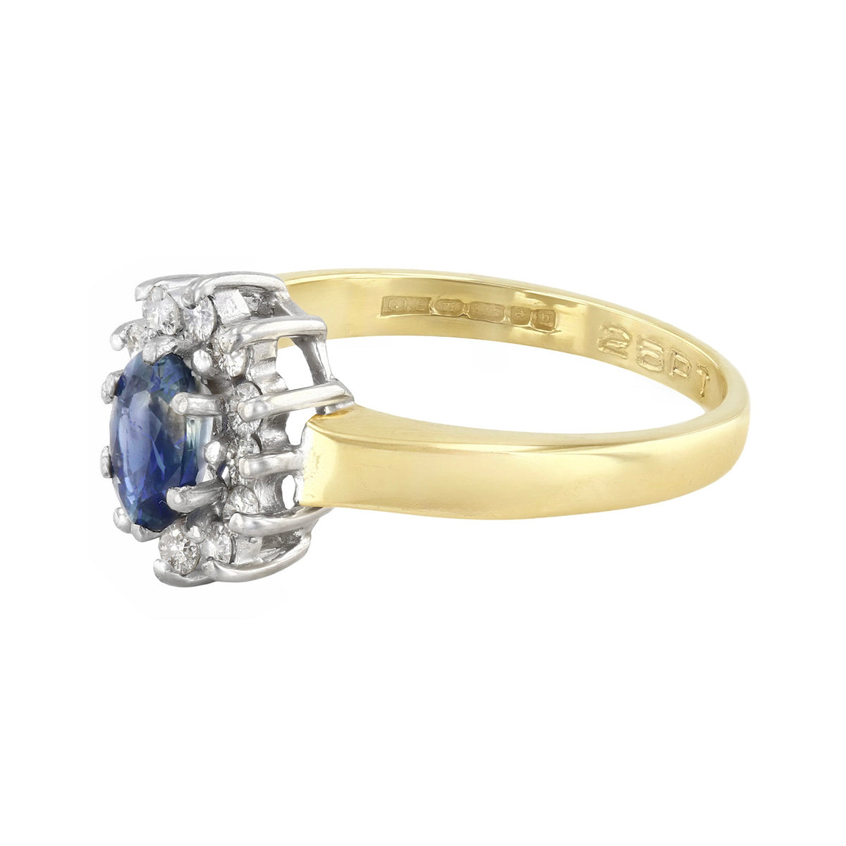 Elegant and timeless, this pre-loved cluster ring showcases a captivating oval-cut sapphire, measuring approximately 6x4mm, surrounded by a cluster of sparkling diamonds with a total diamond weight of 0.06 carats. The diamonds are graded SI2/P1 clarity and I/J colour, offering a beautiful brilliance that enhances the deep blue tones of the central sapphire.