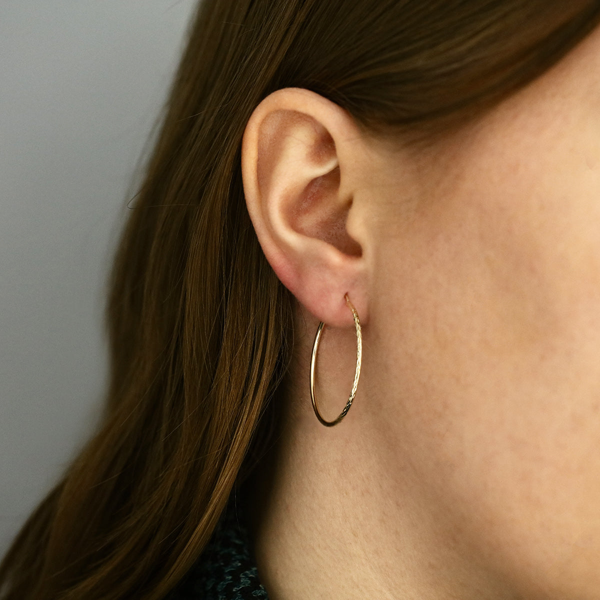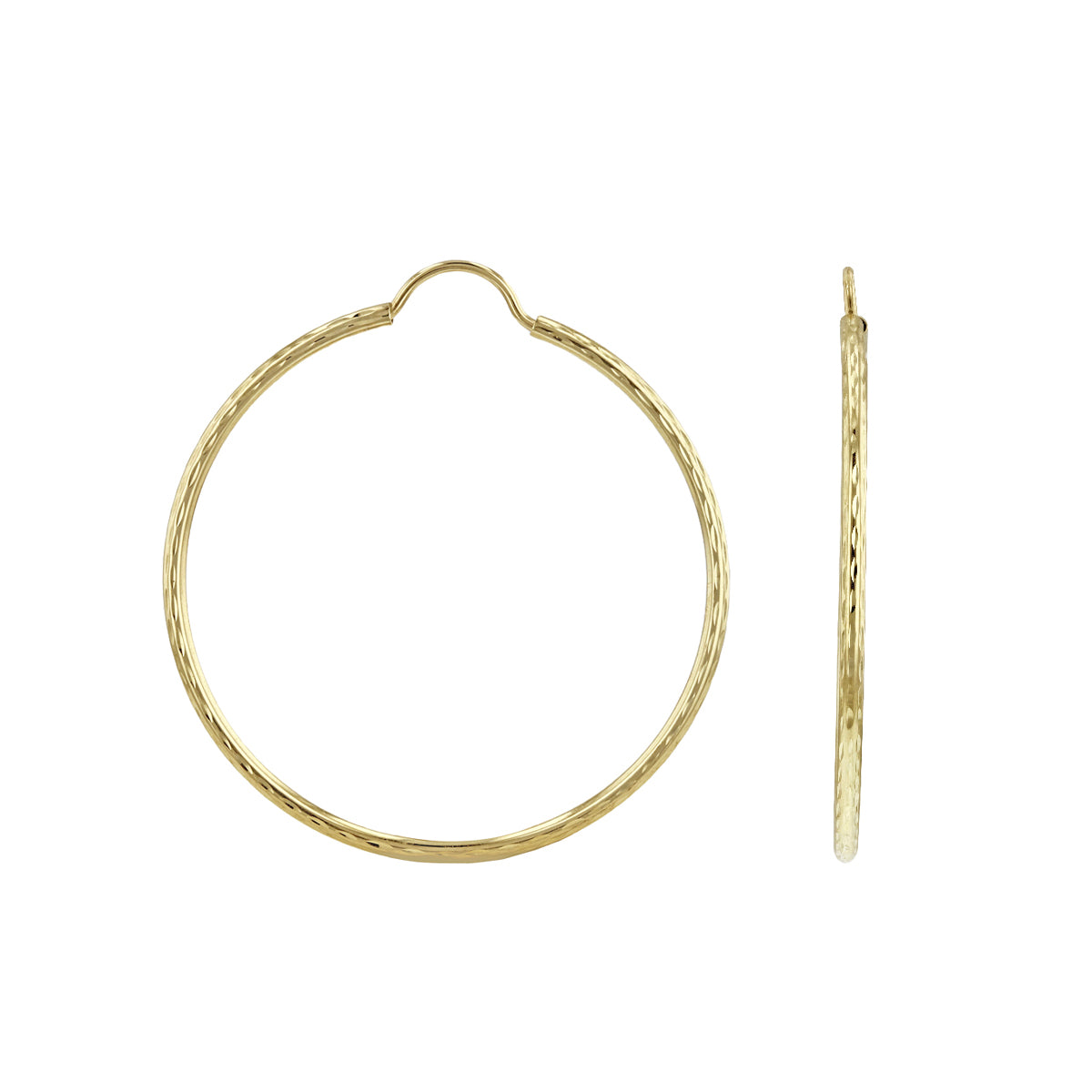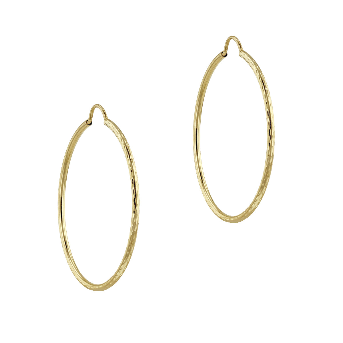 The defining feature of these hoops is the beautiful diamond-cut detailing that adorns the entire surface. Each cut is strategically placed to create a dazzling play of light, mimicking the brilliance of diamonds. The result is a shimmering effect that captures attention and adds a touch of glamour to any ensemble.